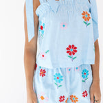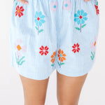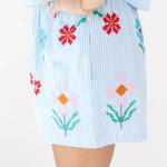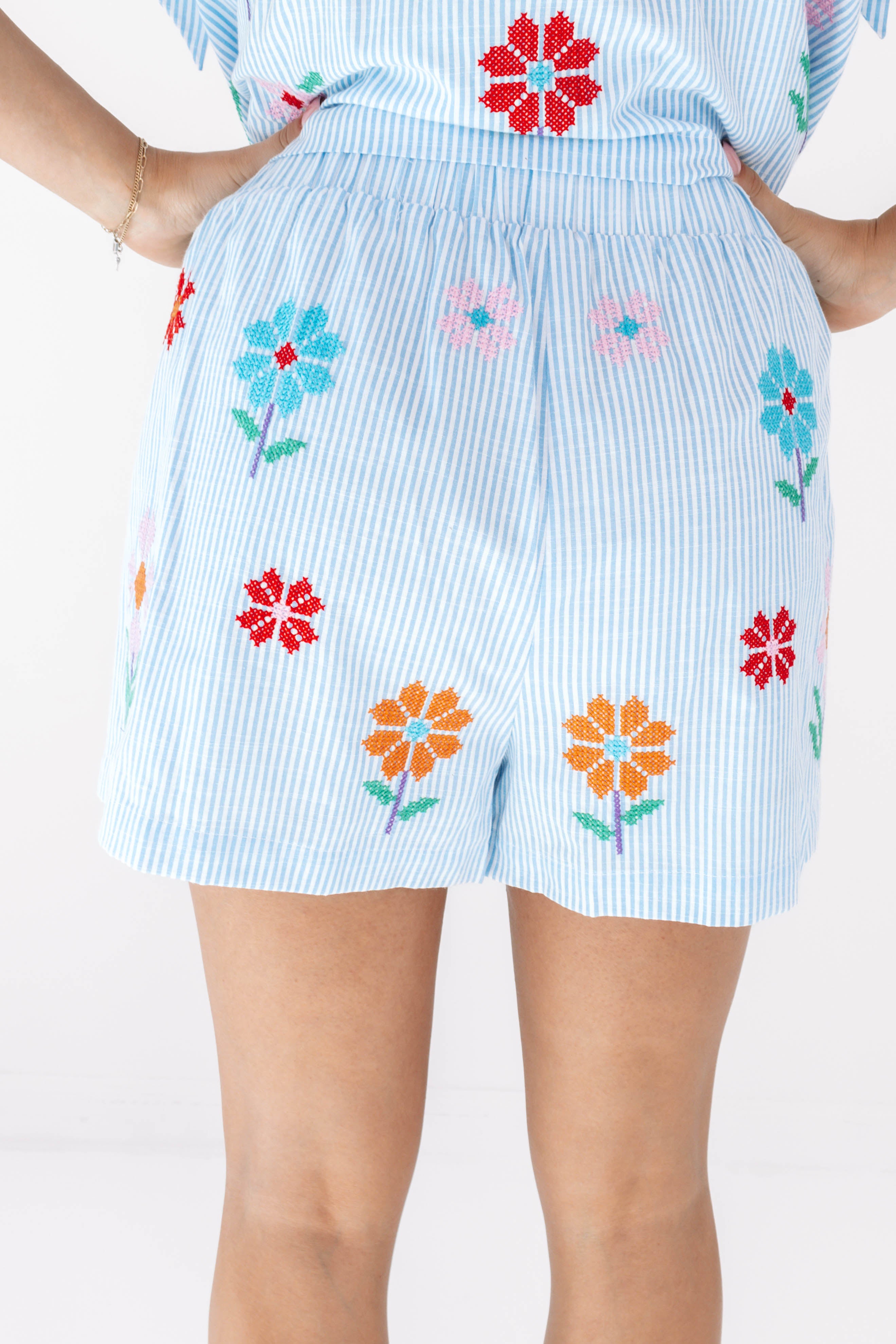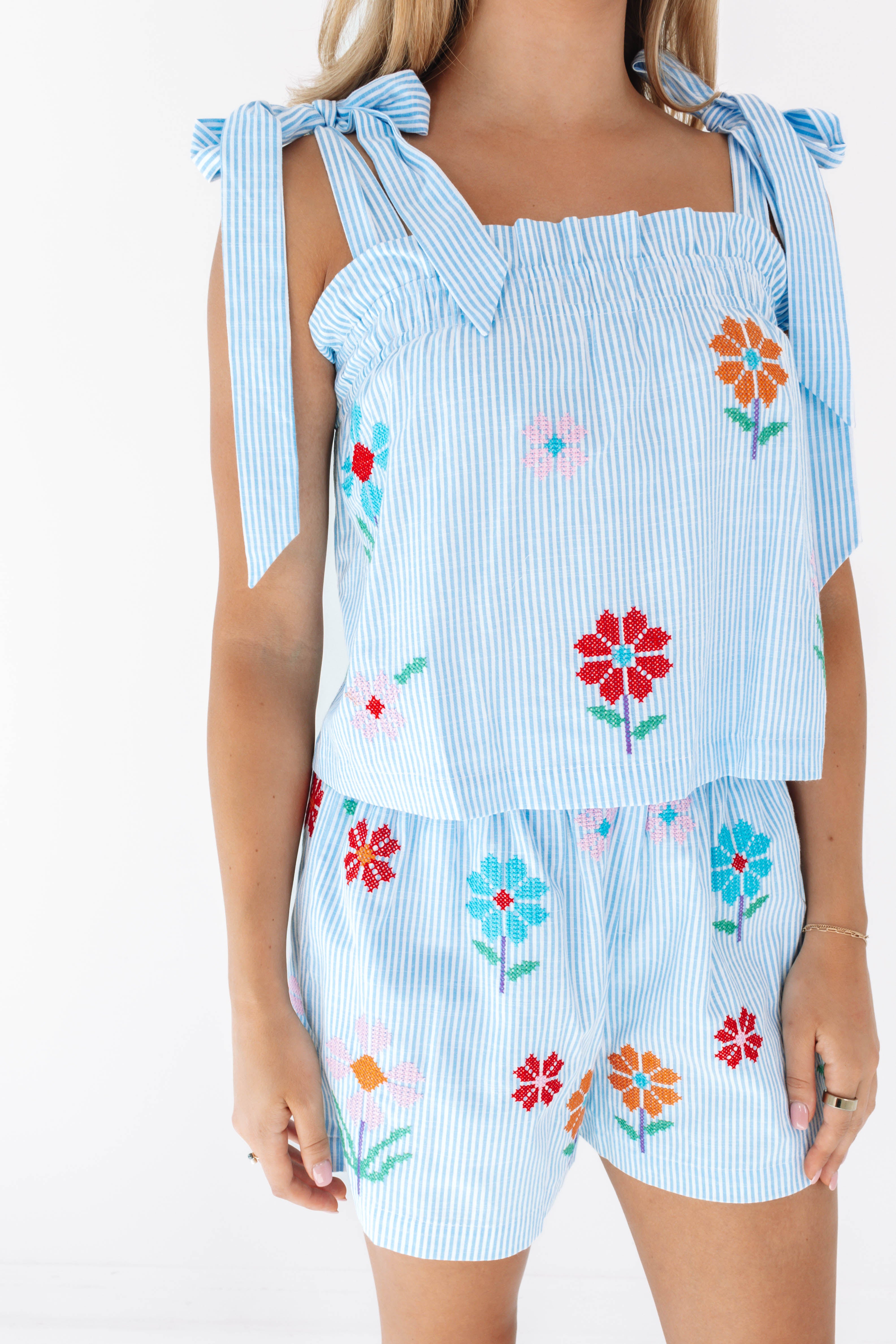These breezy shorts features a soft blue & white stripe & bold embroidered detail, creating effortless movement with every step. Designed for a clean, polished finish, it blends comfort & charm—perfect for pairing with our Hunter Tie Strap Top for brunch dates, garden parties, or sunny spring afternoons out.