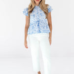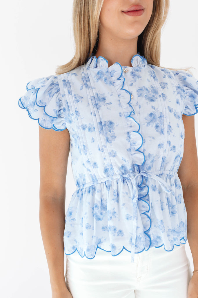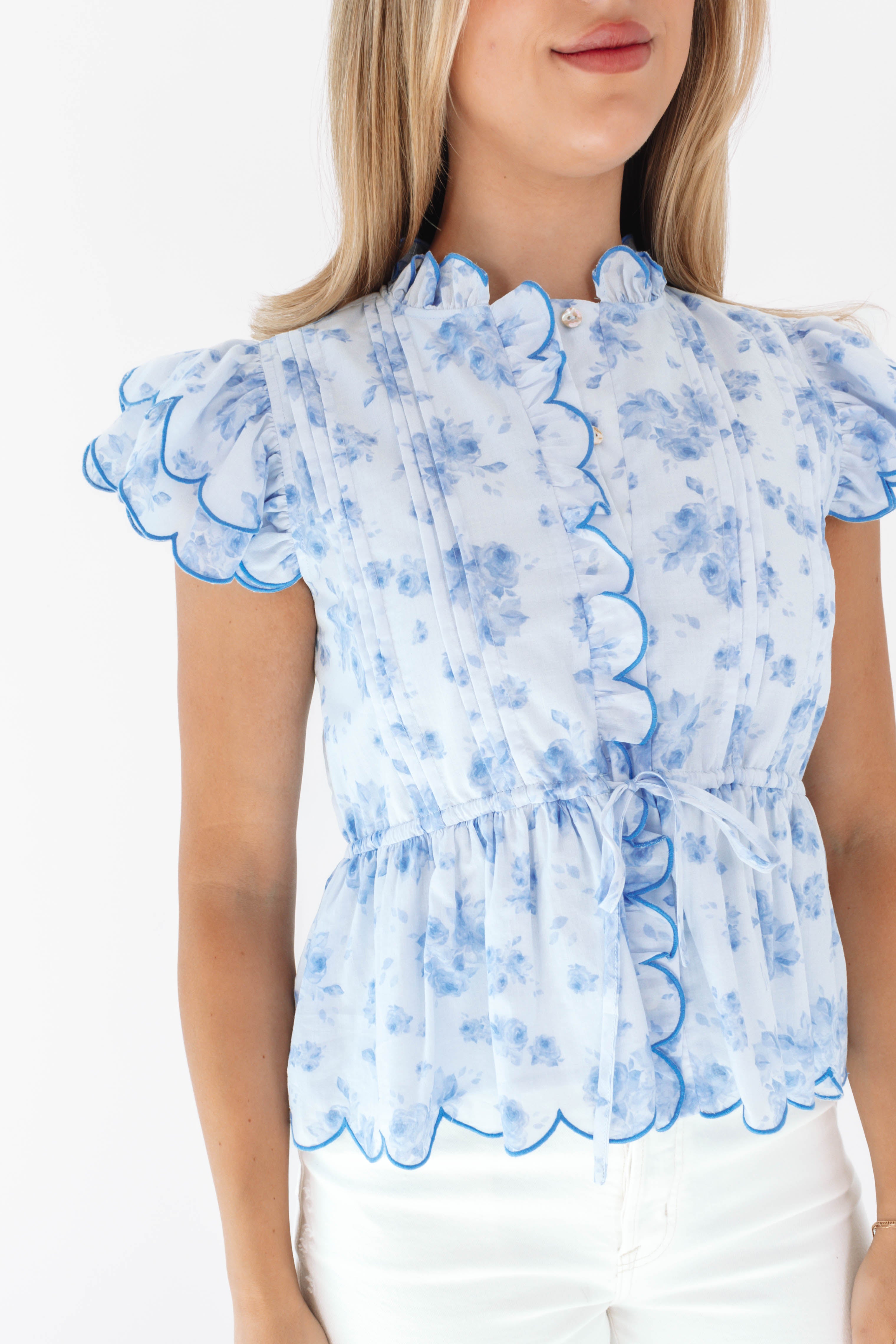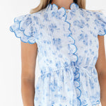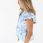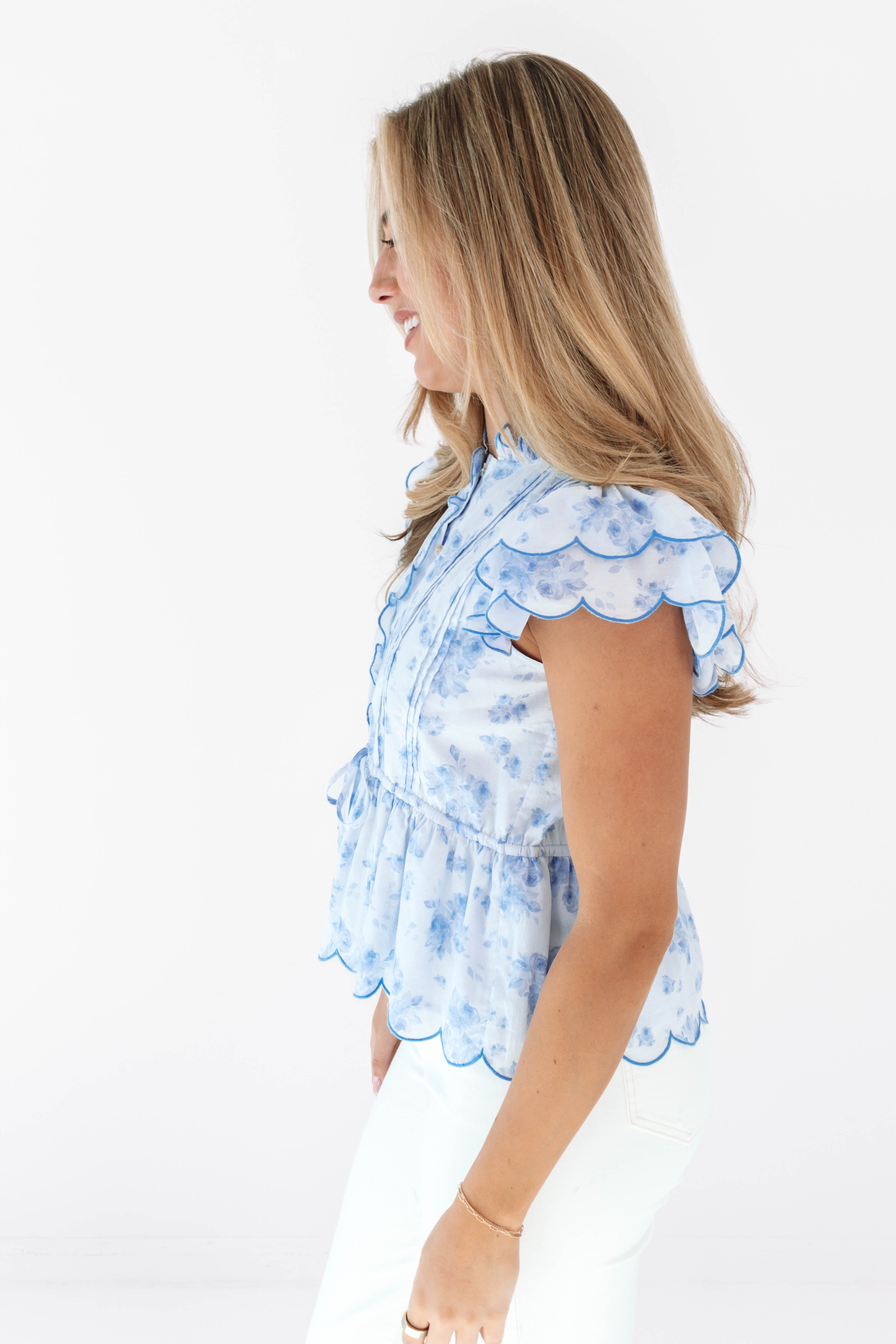 This polished top features a classic blue print accented with delicate scalloped trim for a refined, feminine touch. Designed with a button-up neckline, adjustable tie waist, & flattering peplum silhouette, it blends structure with soft movement—perfect for pairing with your favorite denim for brunch dates, or spring gatherings.