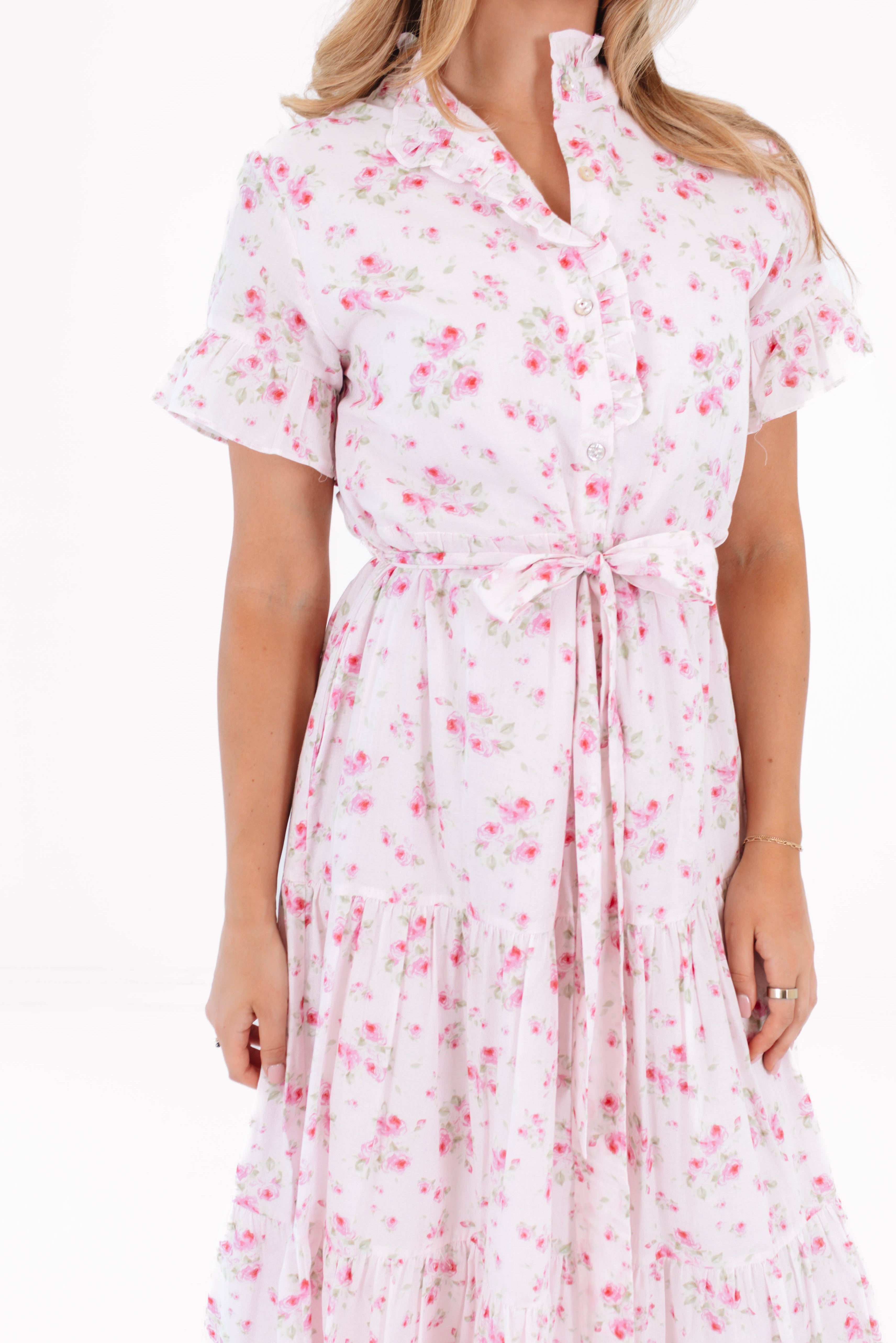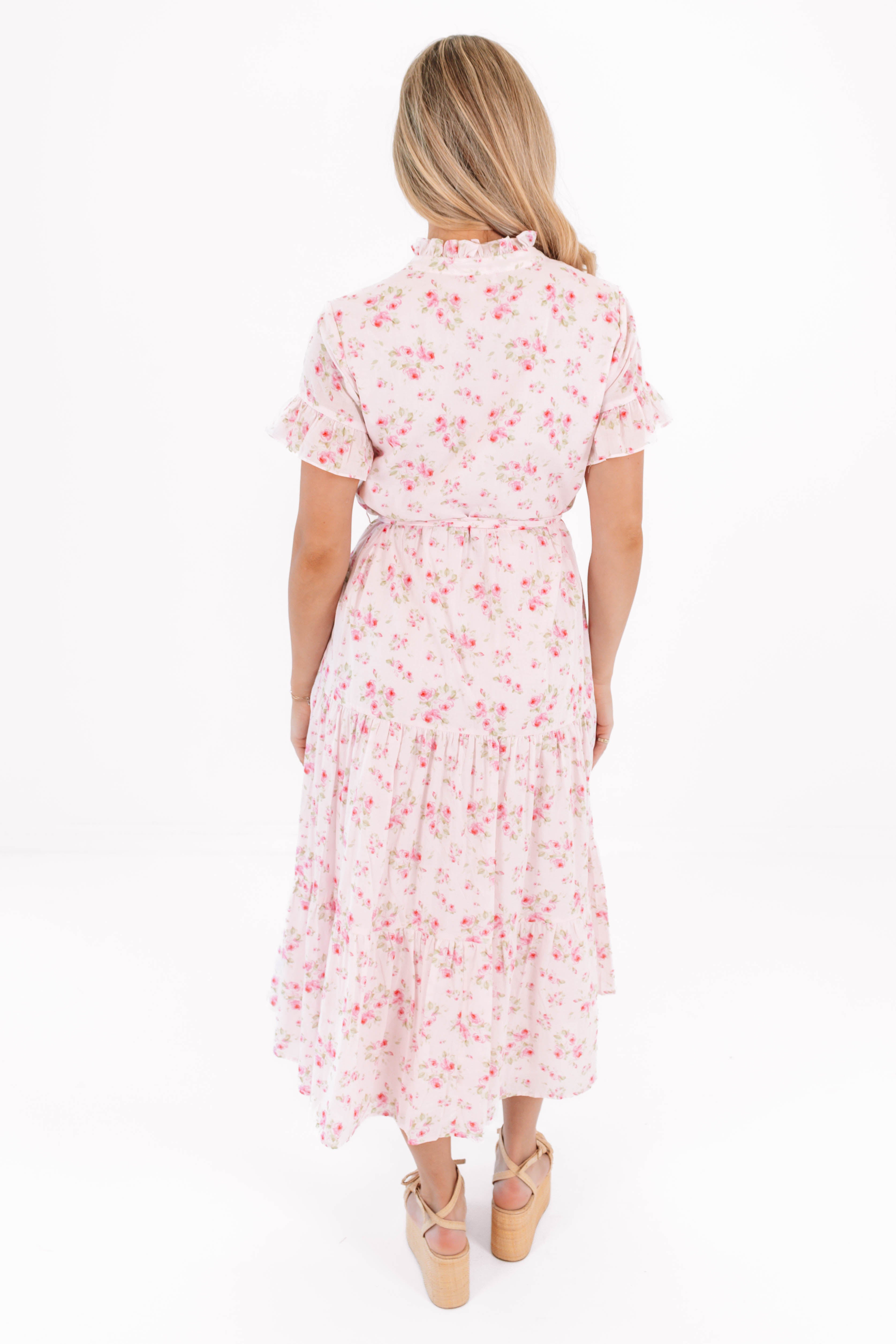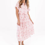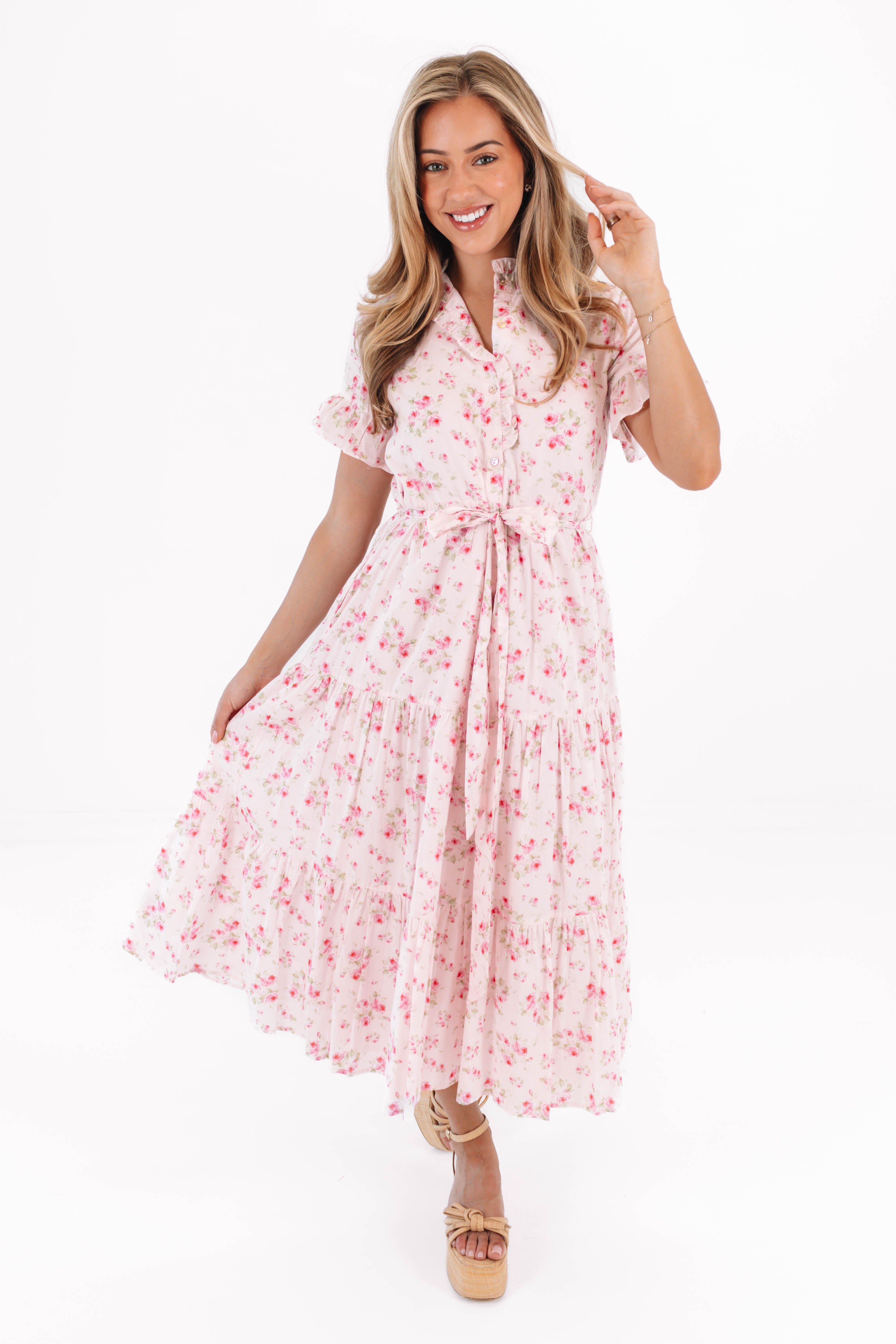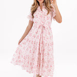 This playful midi dress features button up neckline & ruffle sleeves, adding a touch of charm & movement. With its flowy silhouette & convenient pockets, it's both stylish & practical—perfect for casual outings or a laid-back day of fun!