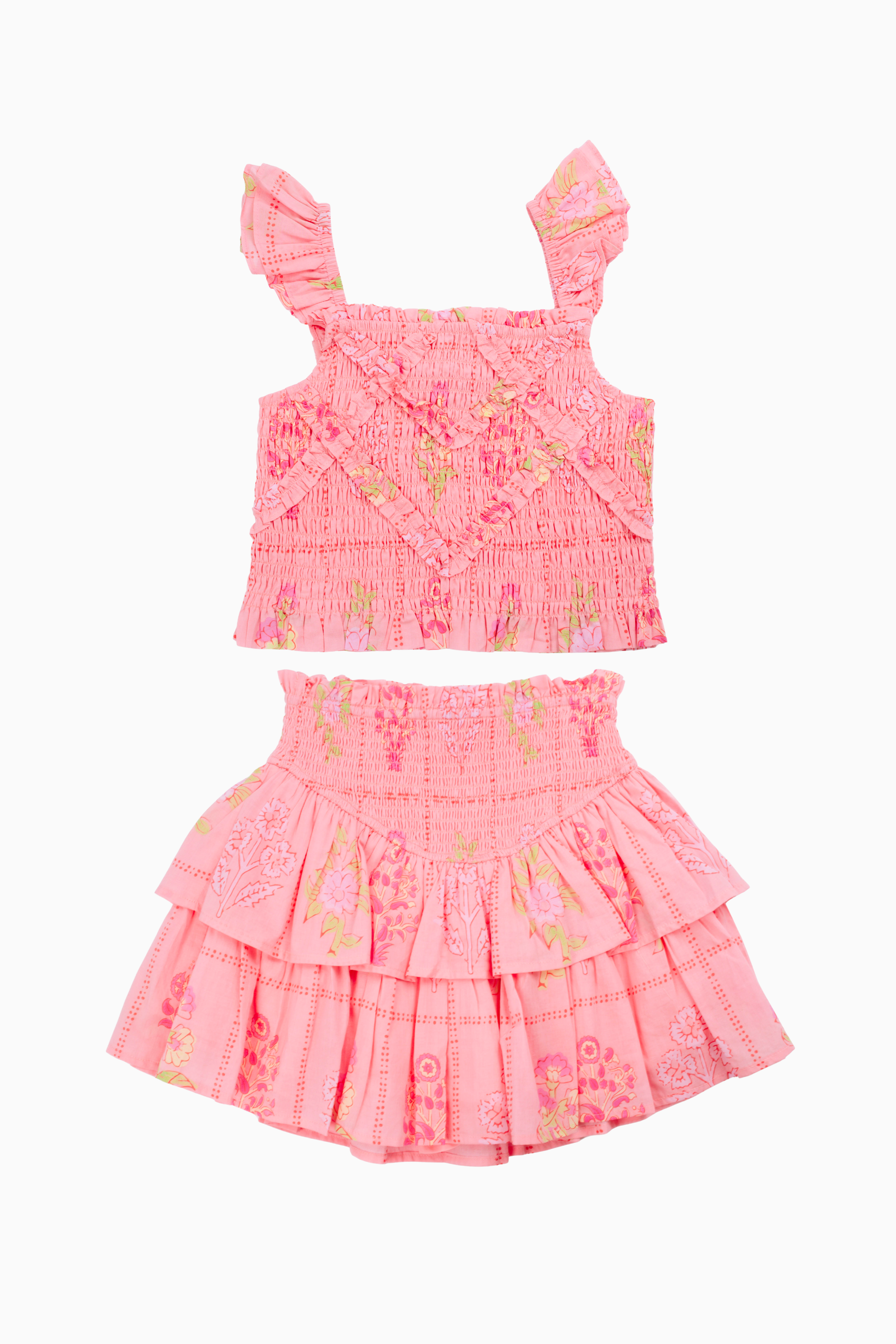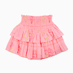 This adorable tween skirt features an elastic waistband and a tiered body for a comfy, cute fit. The playful pink print adds a cheerful touch, making it perfect for fun outings or just a day of play. Stylish and comfortable, it's a fun addition to your little one's wardrobe. Pair with our Emery Ruched Tween Top for an effortless outfit!