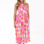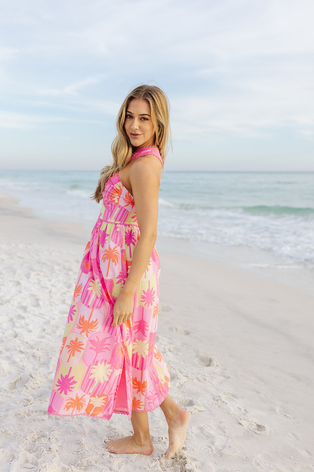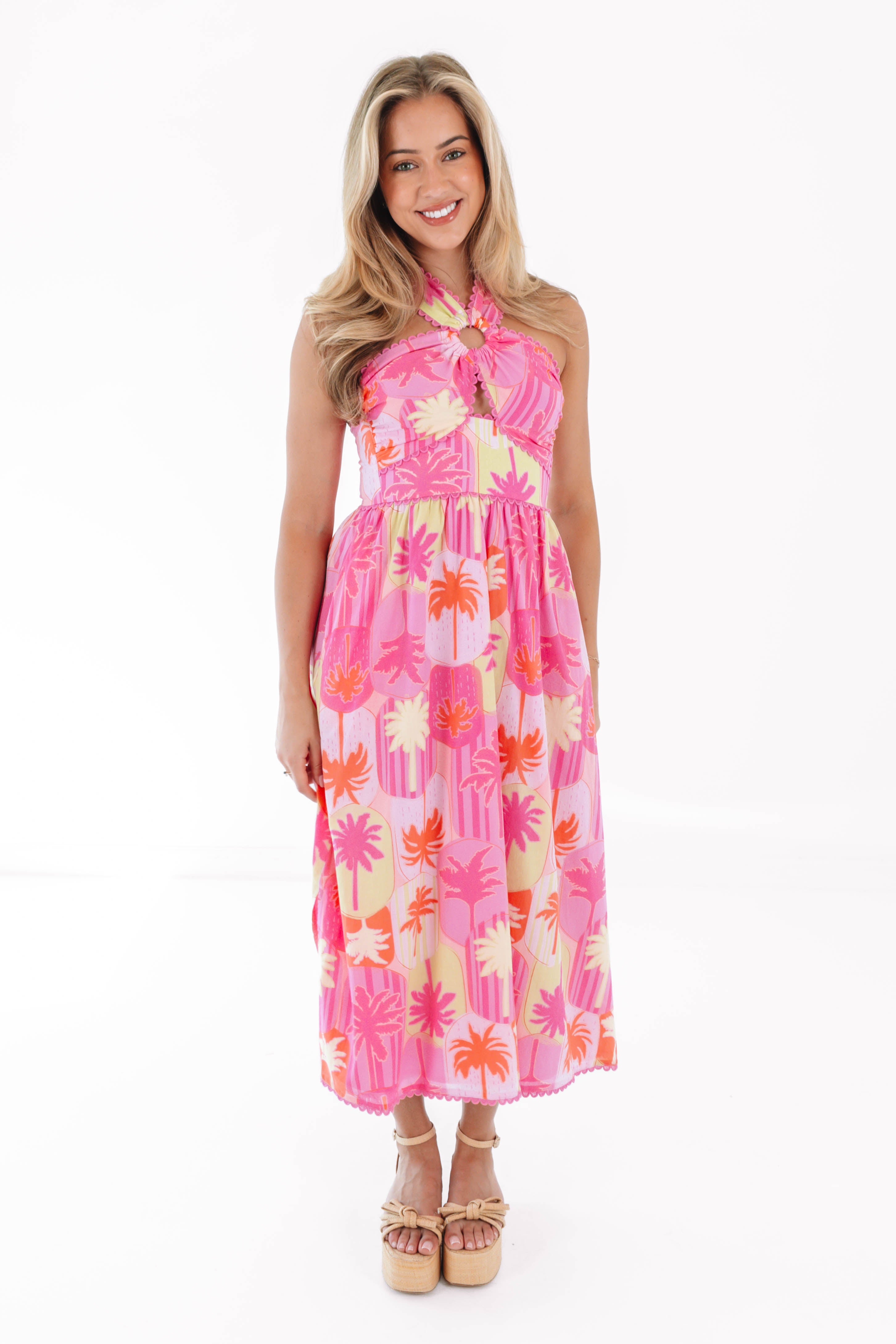 This playful midi dress features a tropical pink print, bringing a fresh & flirty feel to your wardrobe. With ric rac detail adding a playful touch, front cross straps create a flattering sun-kissed look, while the back zipper ensures a sleek fit. Perfect for a spring outing or special occasion, this dress combines style & comfort effortlessly.