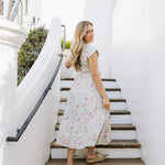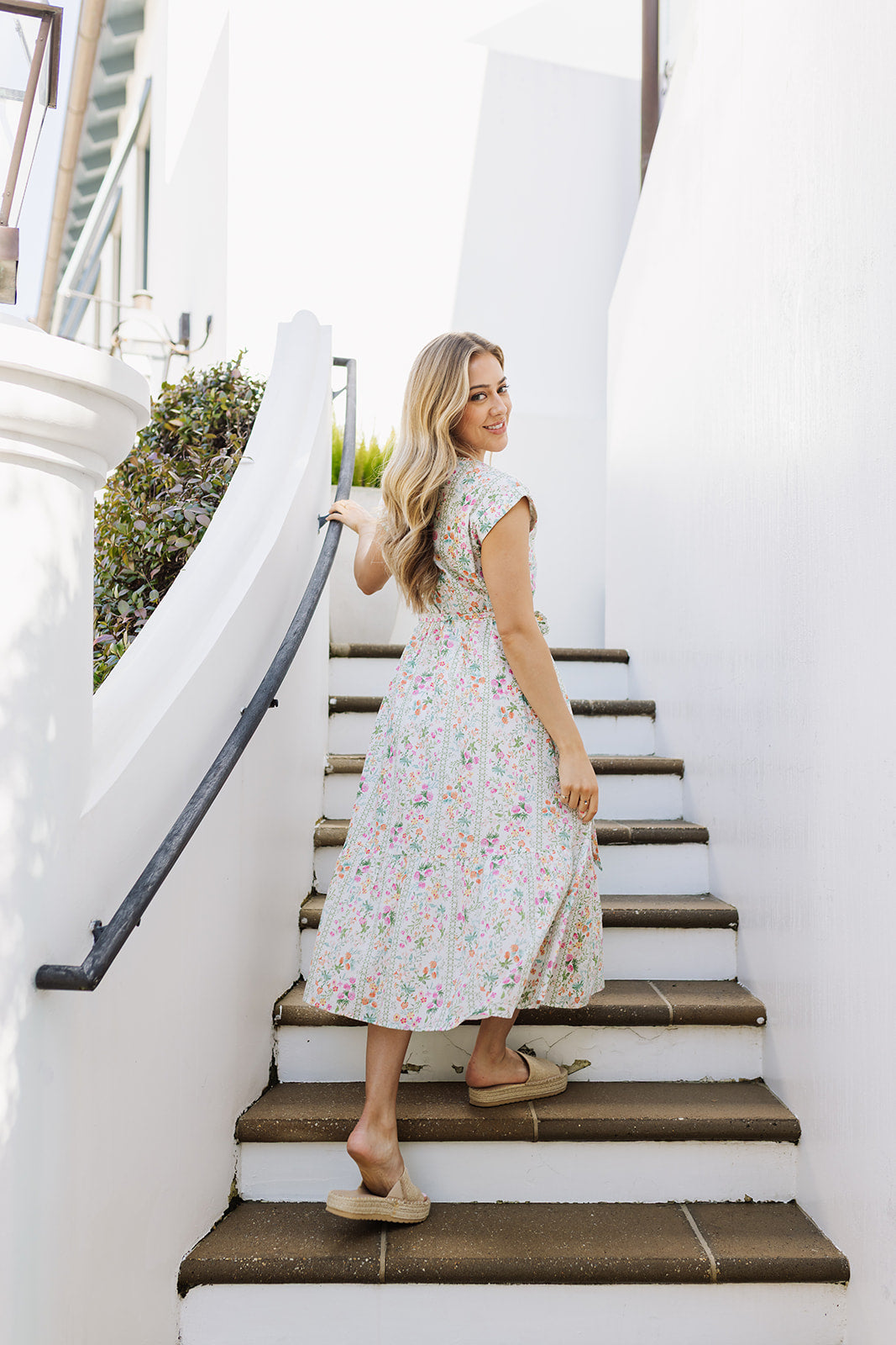 This charming white midi dress features a flattering v-neckline & a button-up front, adding a touch of classic elegance. The short sleeves & flowy silhouette offer comfort & movement, making it perfect for warm weather or layering in cooler months. Its versatile design & soft fabric create a feminine & effortless look ideal for any casual or semi-formal occasion.
