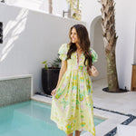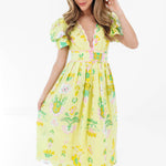 Bring on spring vibes in this floral print midi dress, awash in shades of lime, pink, & green. Statement bow sleeves sit sweetly on the shoulders, while a scalloped v-neckline & cinched waist flatter every curve. A whimsical look made for starry nights & sunny days alike.