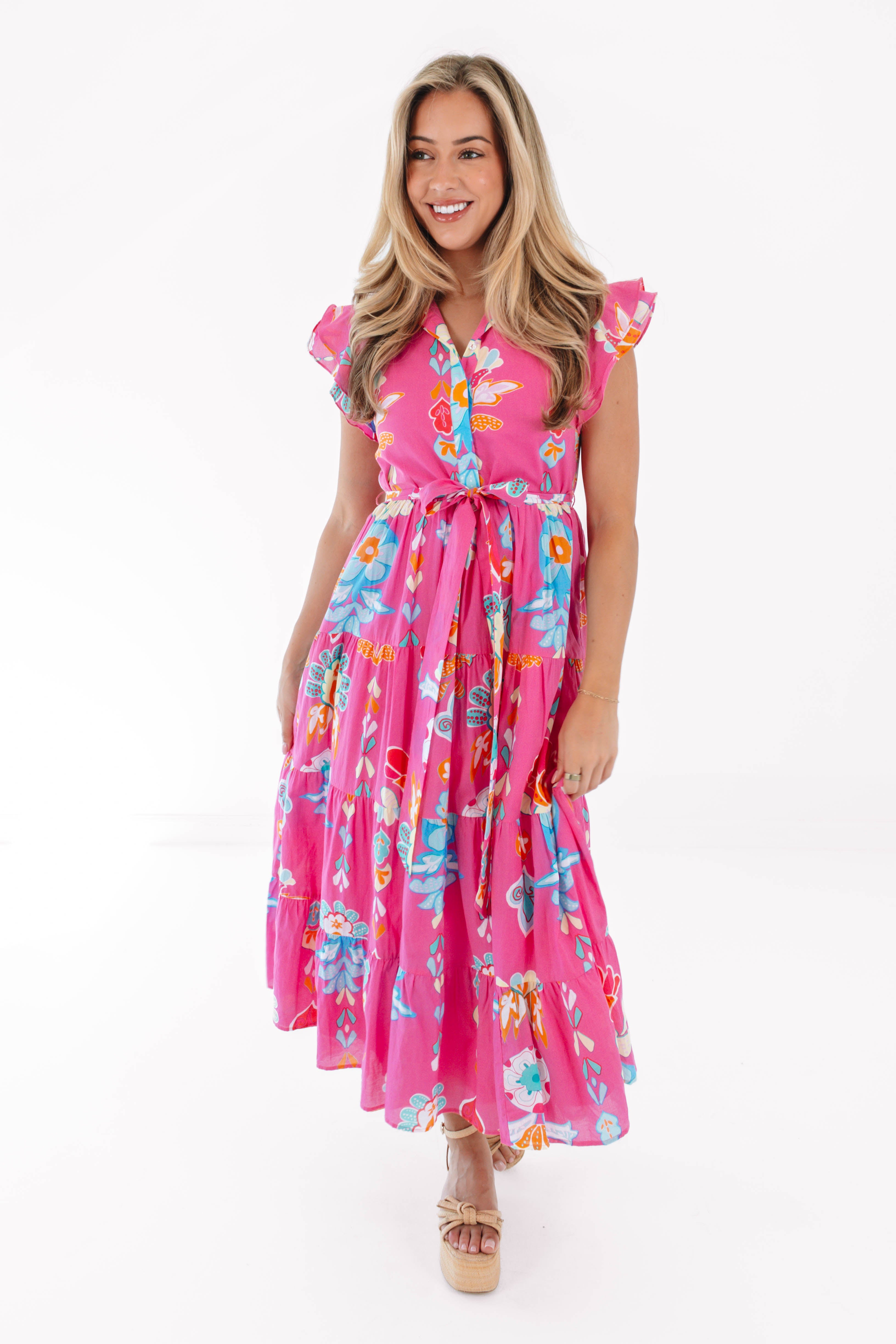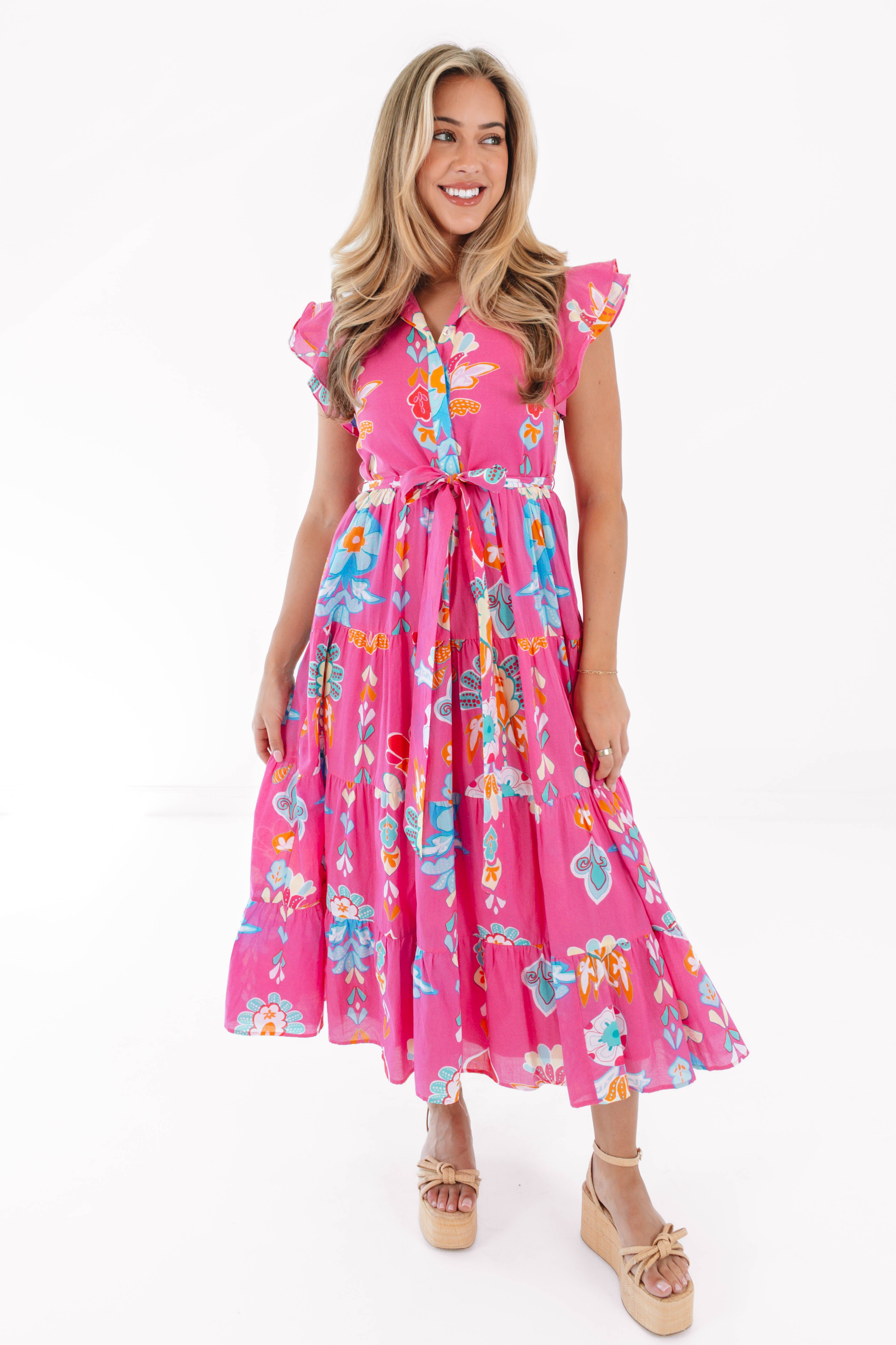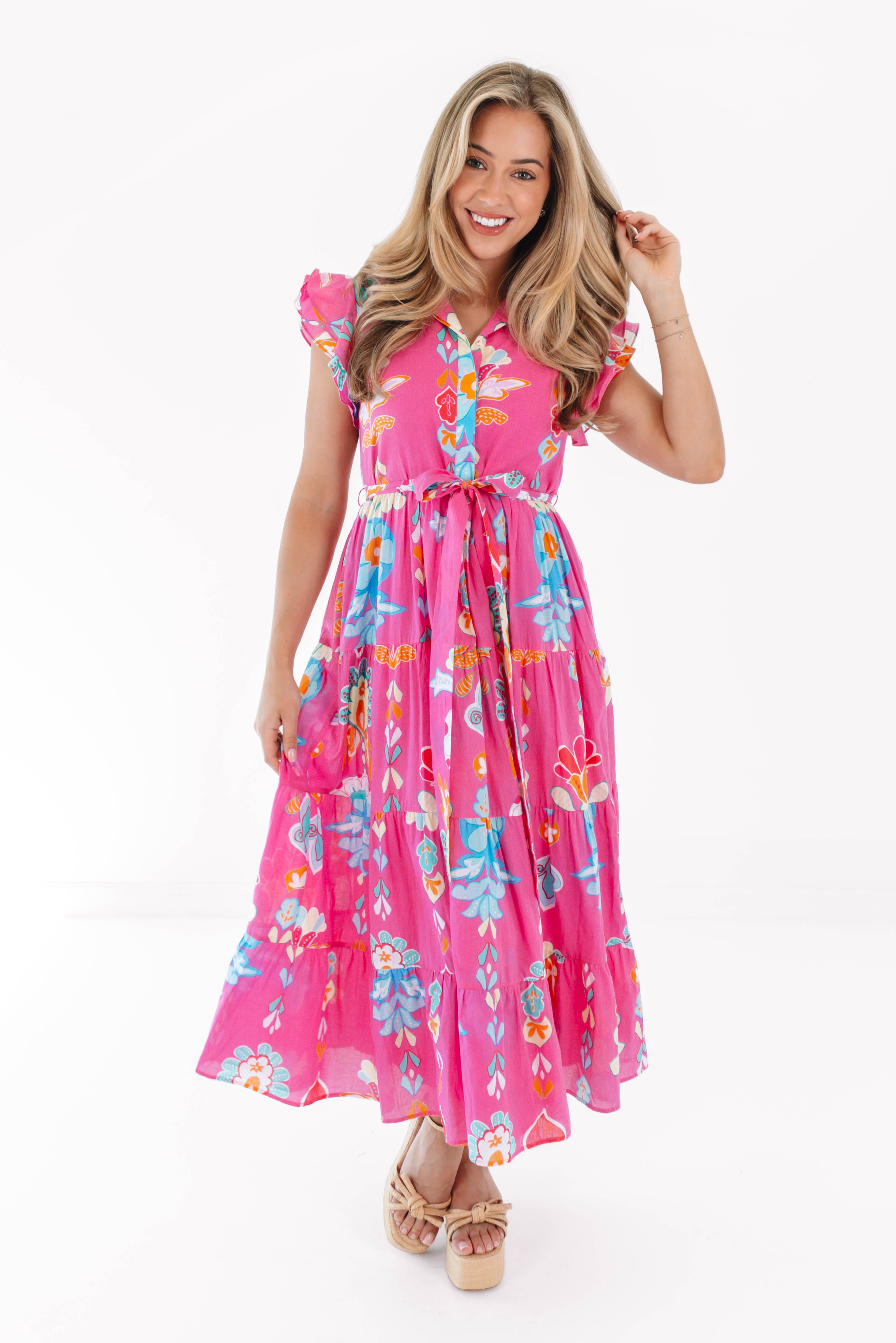 This playful midi dress features button up neckline & ruffle sleeves, adding a touch of charm & movement. With its flowy silhouette & convenient pockets, it's both stylish & practical—perfect for casual outings or a laid-back day of fun!
