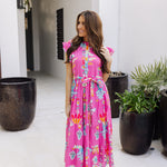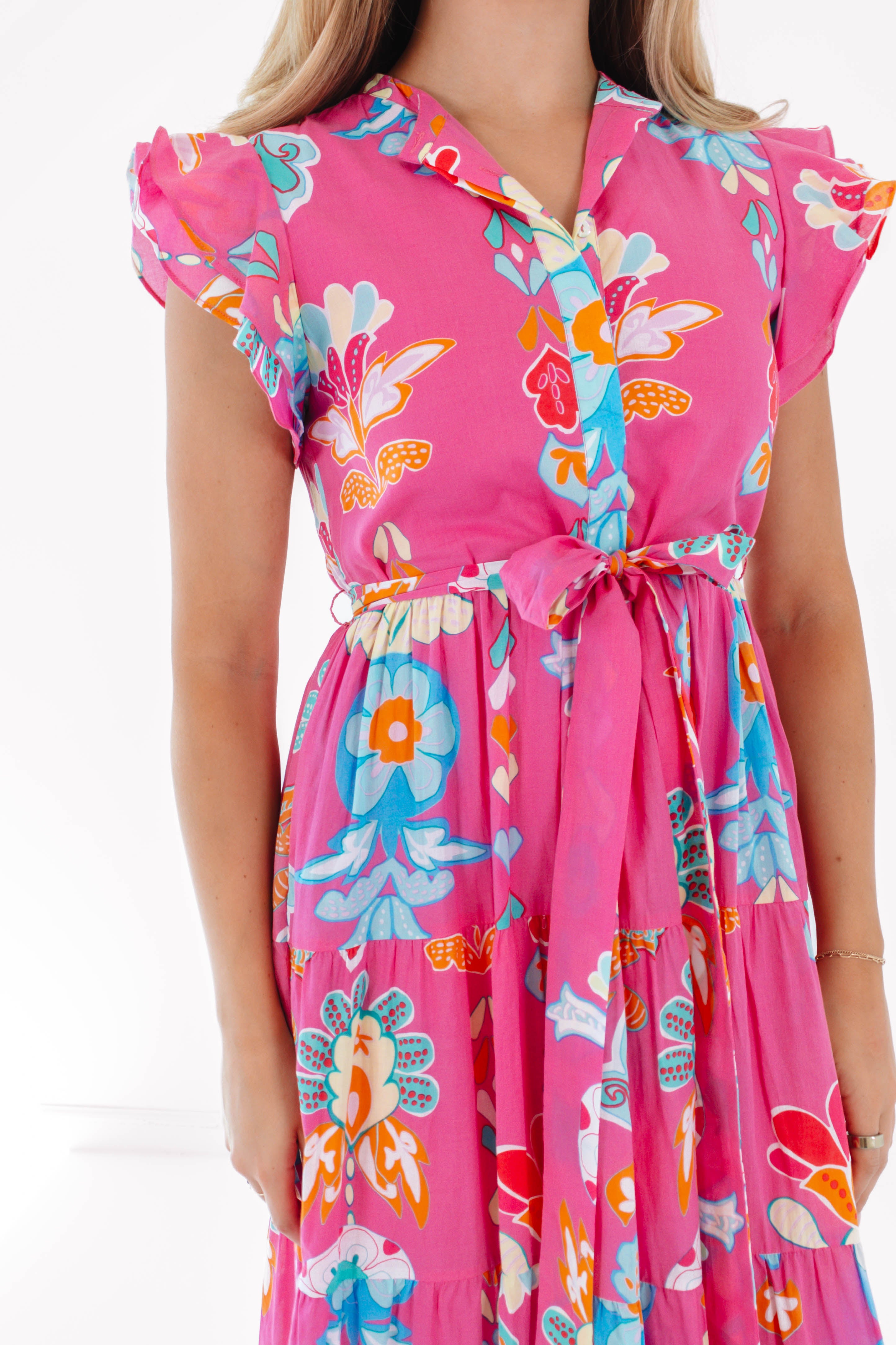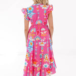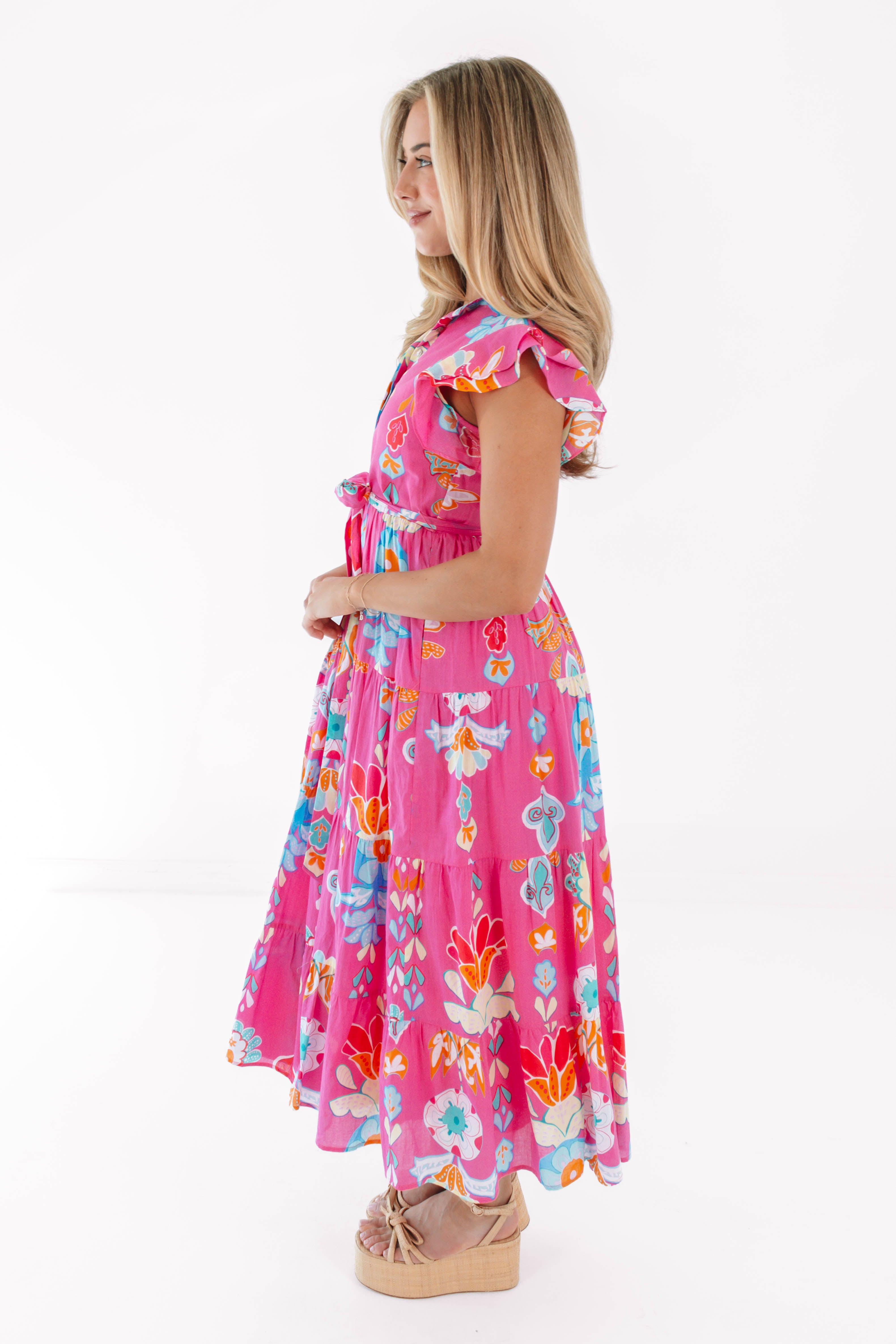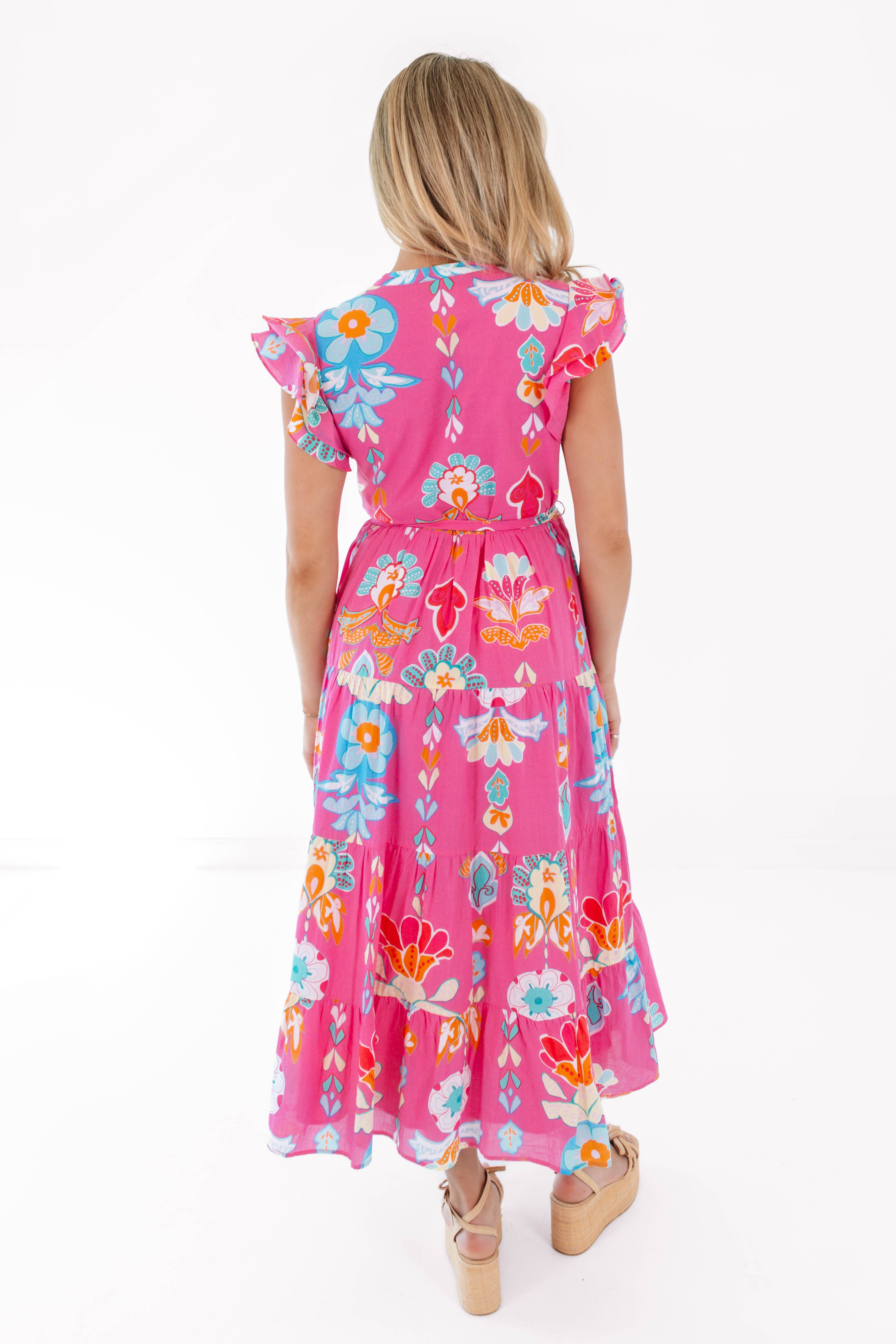 This playful midi dress features button up neckline & ruffle sleeves, adding a touch of charm & movement. With its flowy silhouette & convenient pockets, it's both stylish & practical—perfect for casual outings or a laid-back day of fun!