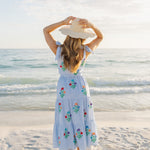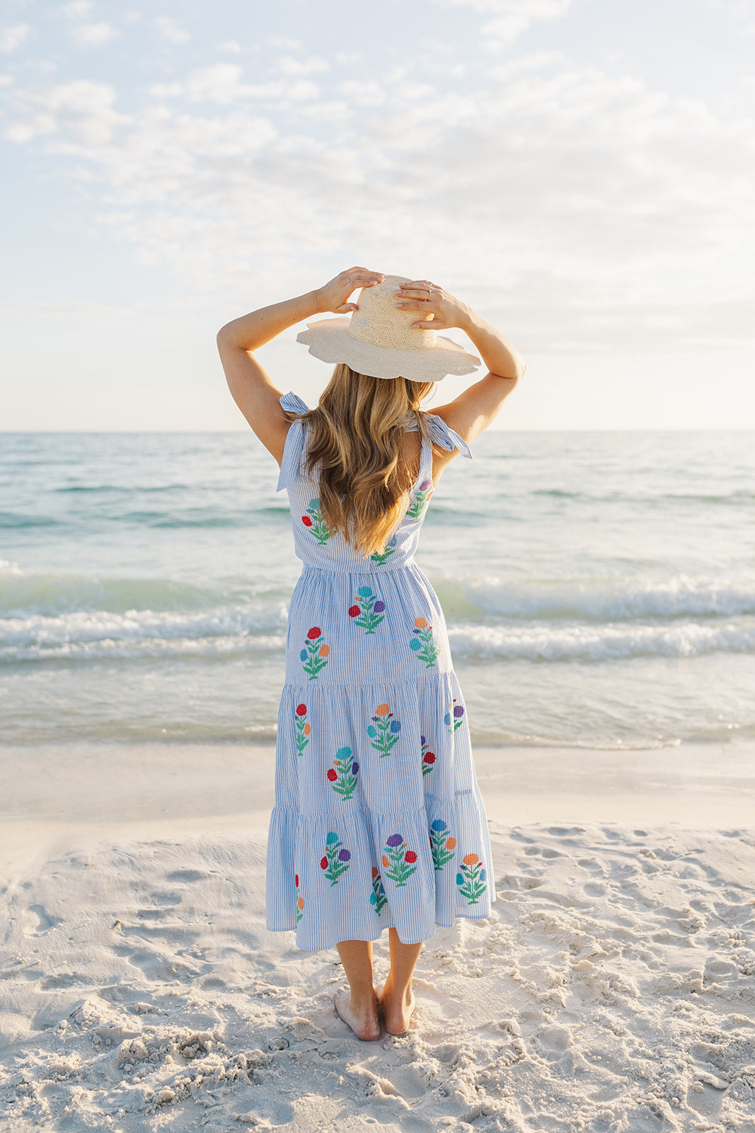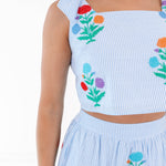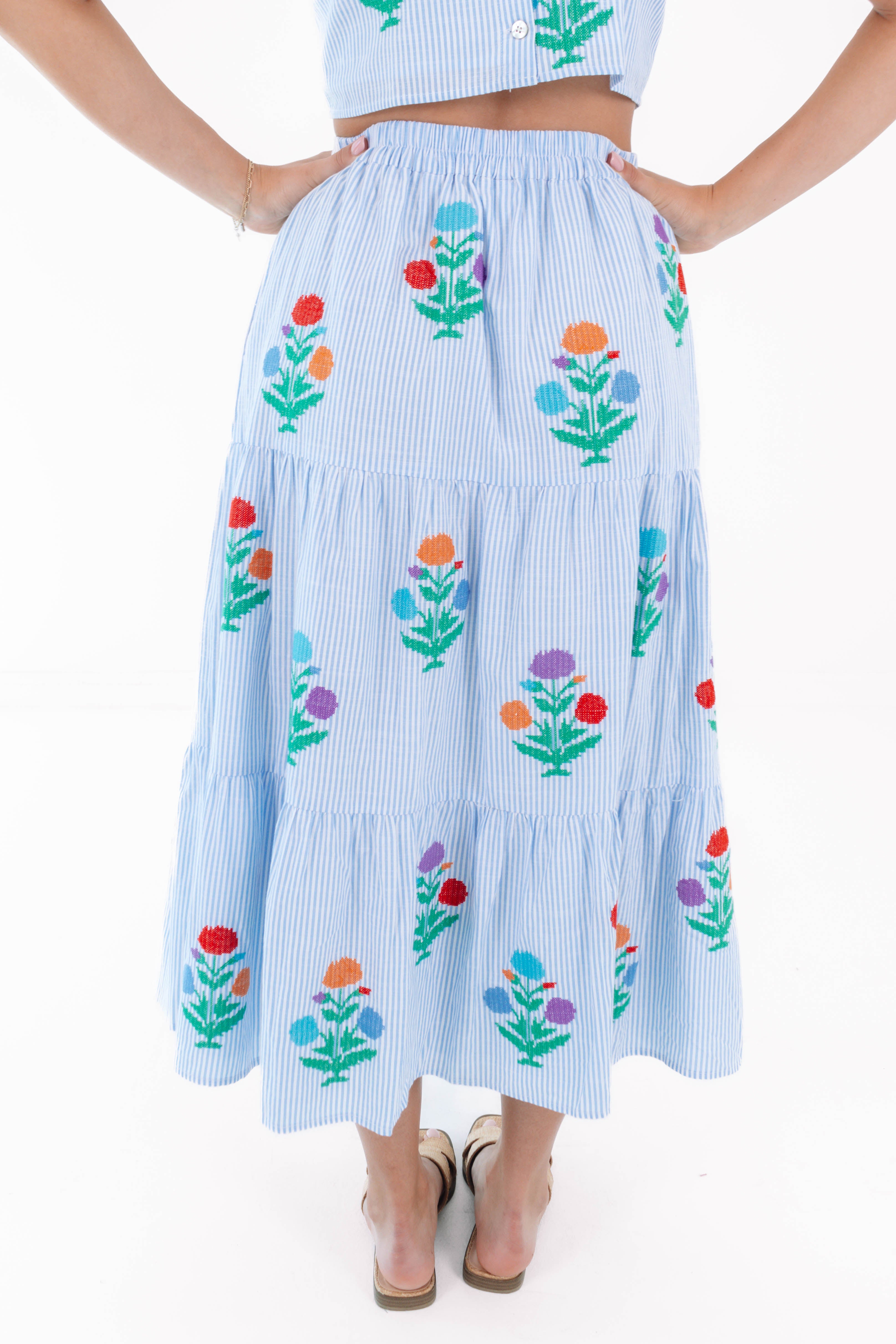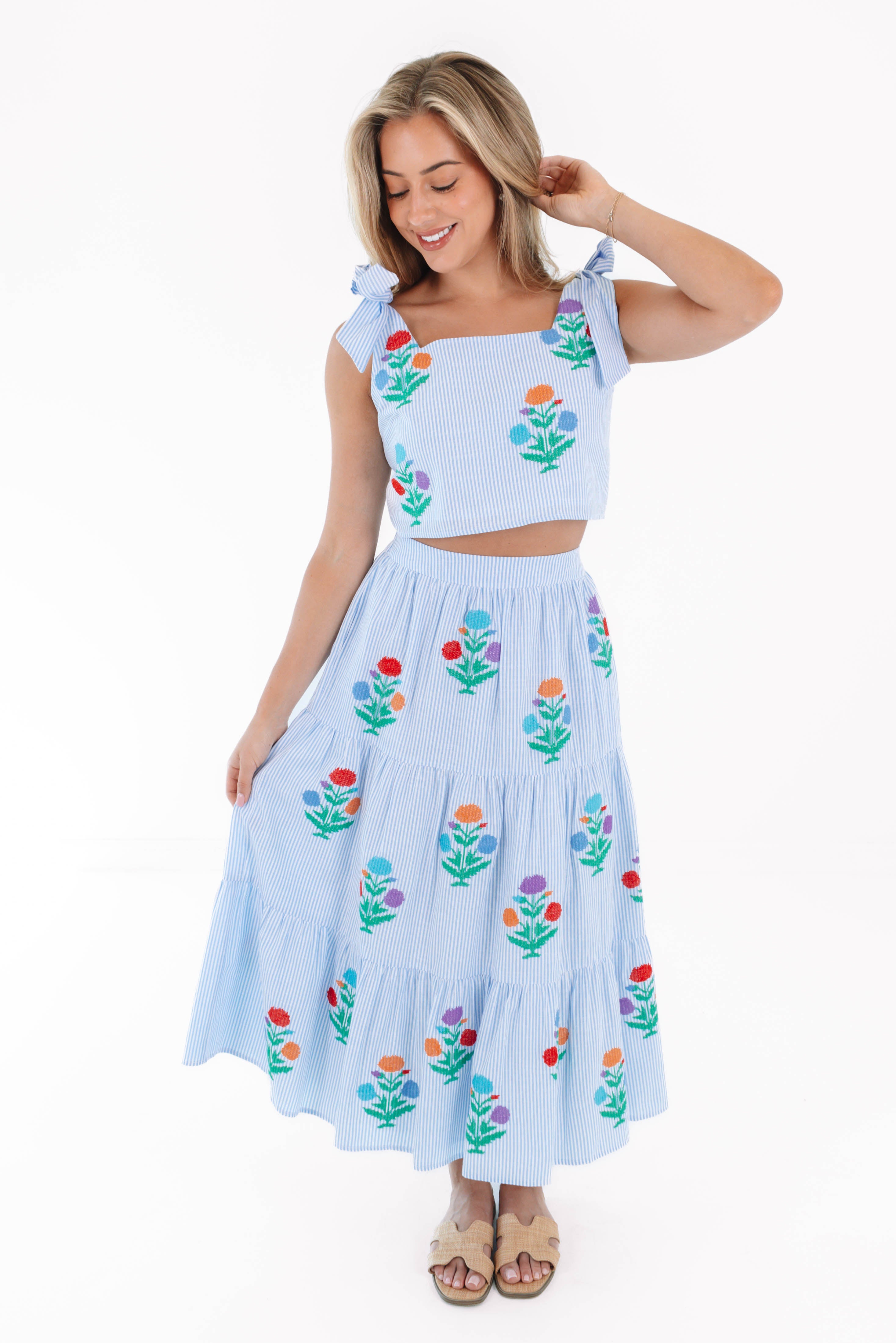 This elegant midi skirt features a blue & white stripe with pops of embroidered detailing for a romantic, elevated feel. Designed with a flattering, flowy silhouette that moves beautifully with every step, it’s both timeless & versatile—perfect for pairing with our Samson Top for garden parties, brunch dates, or any spring celebration.