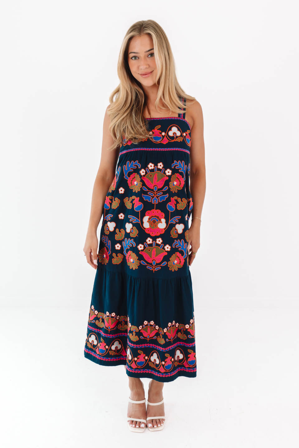 This navy midi dress features multi colored embroidery, adding a fresh, moody feel perfect for fall. The embroidered straps and fitted bust create a flattering, feminine silhouette, making it a versatile choice for both casual and dressier occasions. Effortlessly stylish and charming, this dress is perfect for sunny days and cool evenings!