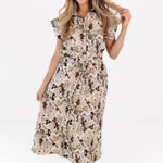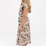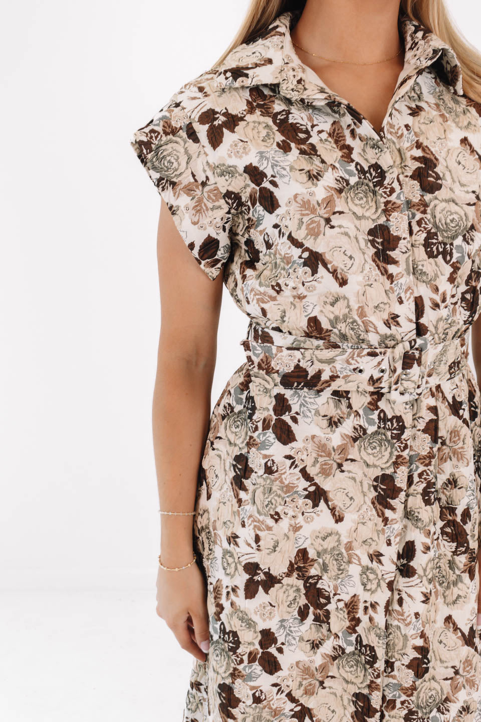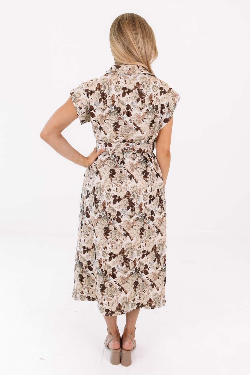 This charming cream midi dress showcases a bold print and a flattering adjustable tie waist for a timeless, feminine look. The button-up neckline and short sleeves add a classic touch, making it effortlessly polished. With its warm tones and easy silhouette, it’s the perfect piece for fall outings or brunch dates.
