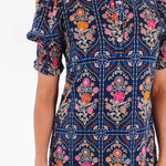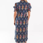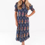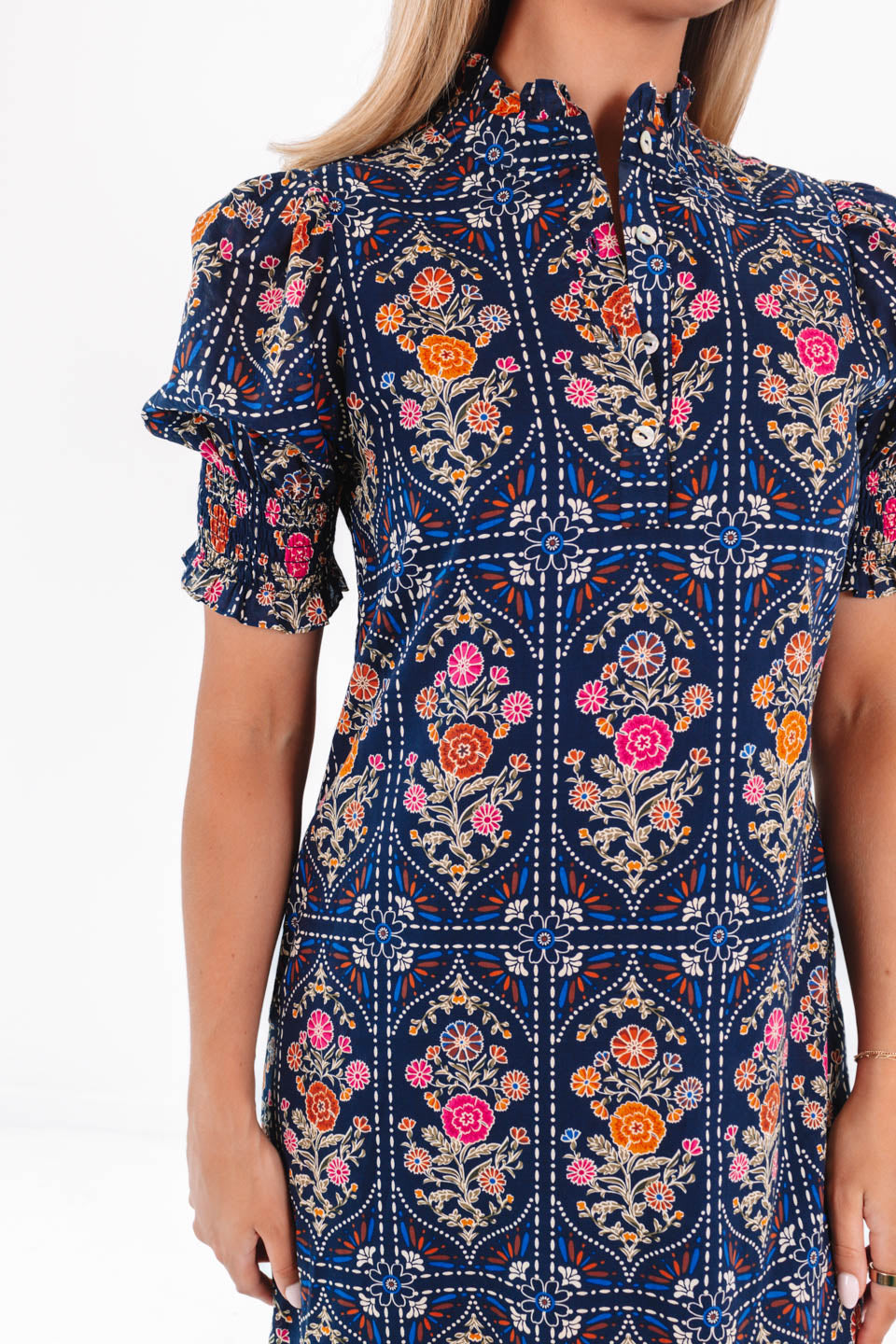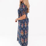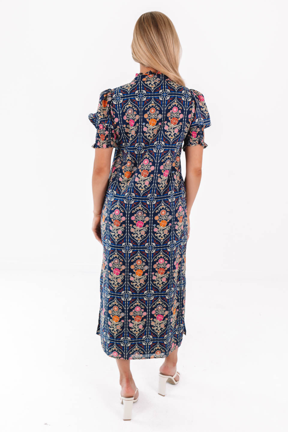 Embrace fall vibes with this navy print midi dress, featuring a ruffle neckline, puff sleeves with ruched detail, and a classic button-up front. With its timeless silhouette and effortless charm, it’s the perfect piece for autumn outings and golden-hour moments!