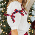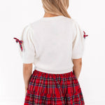 Bring cozy holiday charm to your wardrobe with this white fitted sweater adorned with sweet red plaid bows. Its puff sleeves & darling details add a touch of whimsy - perfect for warmer days & cheerful holiday outings. Pair with our Hollin Skort for the perfect holiday look!