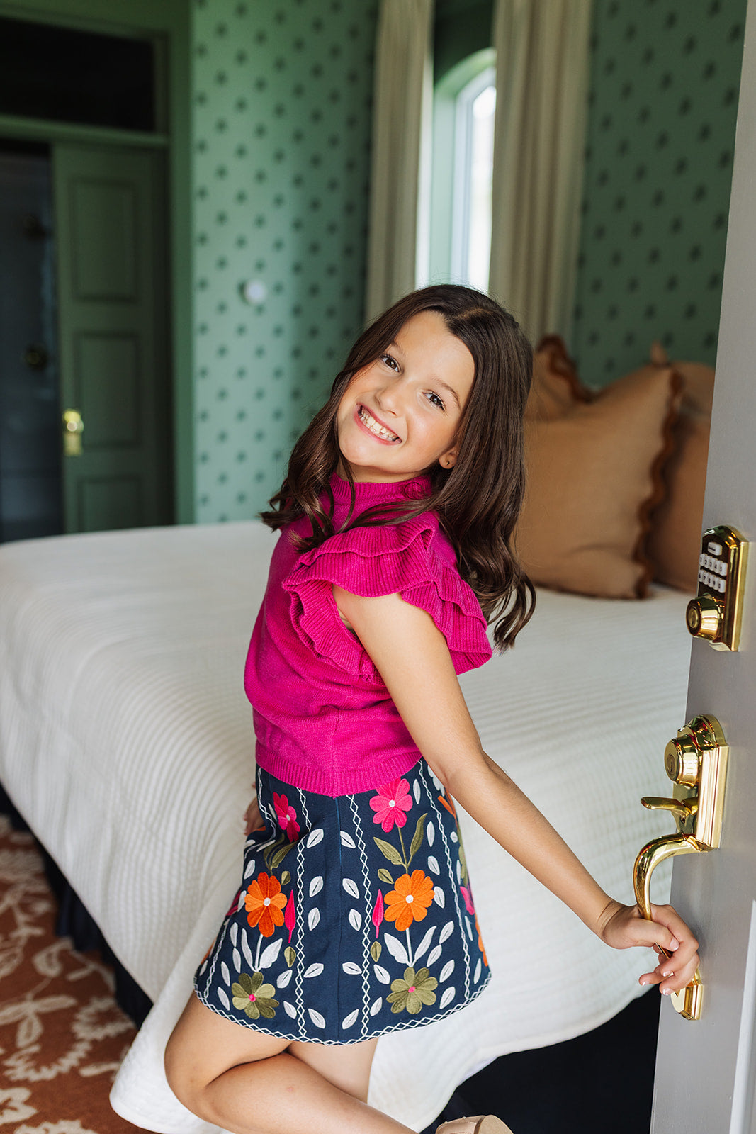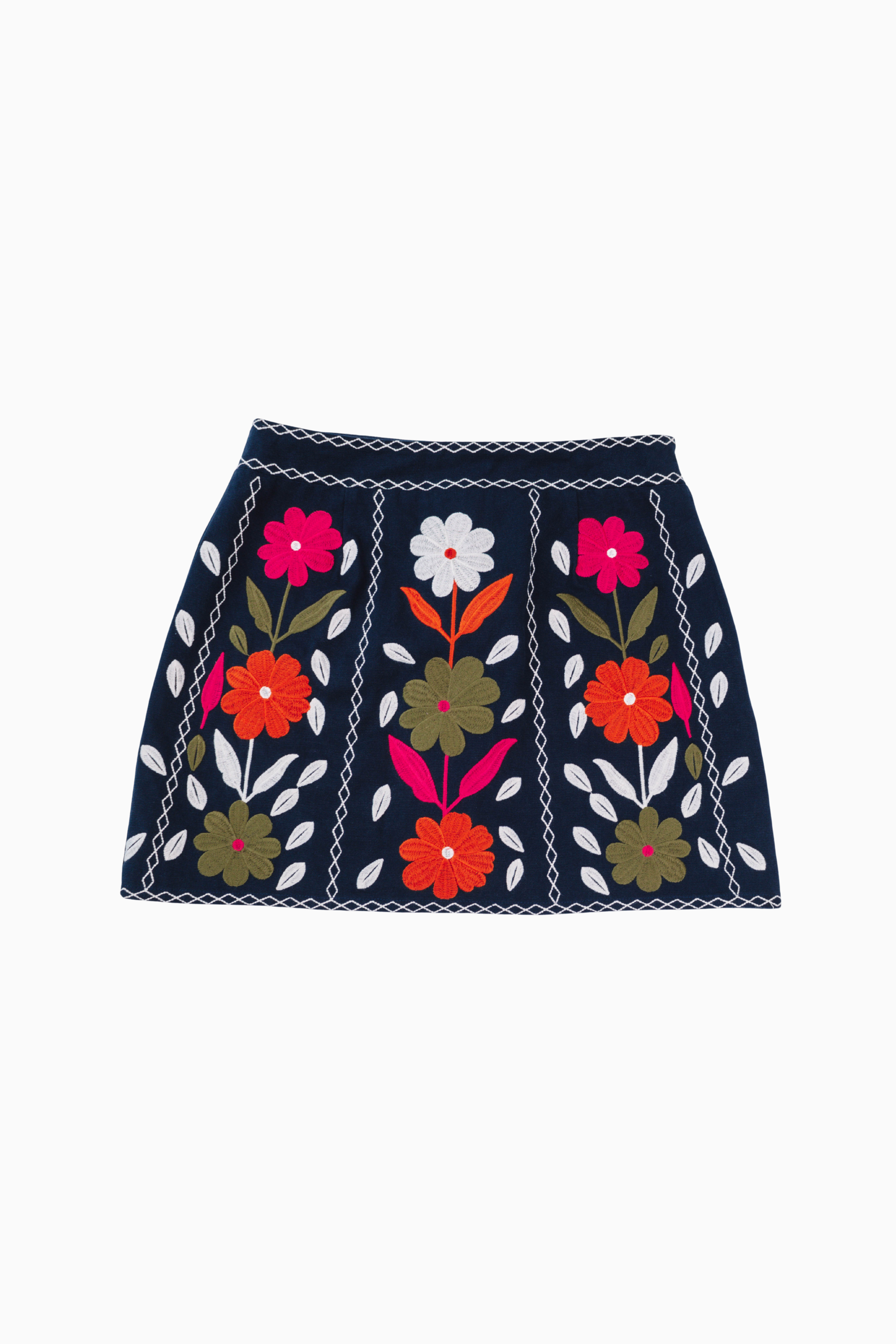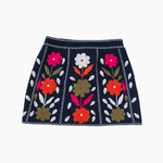 This adorable tween skirt features a bold embroidery throughout. The navy with multi floral print adds a cheerful touch, making it perfect for fun outings. Stylish & comfortable, it's a fun addition to your little one's wardrobe. Pair with our Annie Tween Sweater for an effortless outfit!
