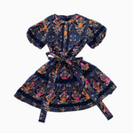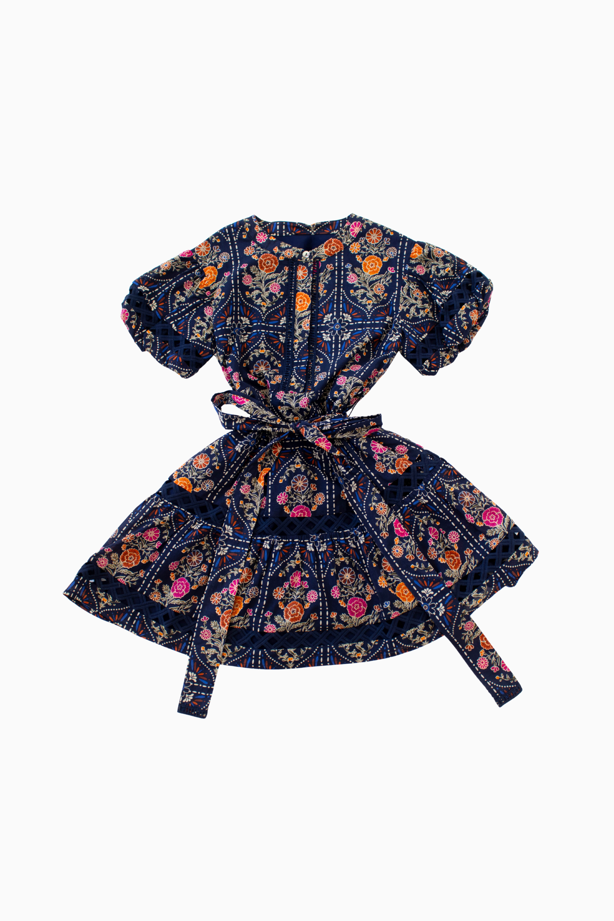 Embrace fall vibes with this sweet tie dress in a bold navy print with pops of pink. Featuring a tie belt, embroidered detail, & a button up neckline making this dress playful & polished. Perfect for crisp fall evenings!