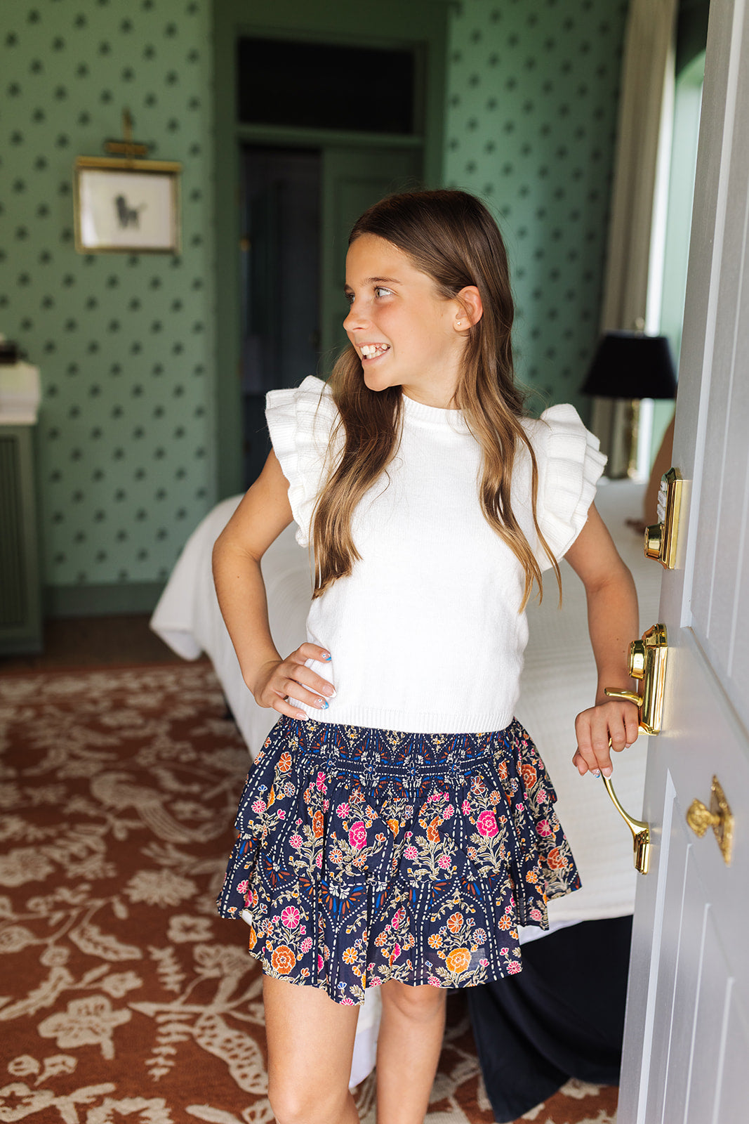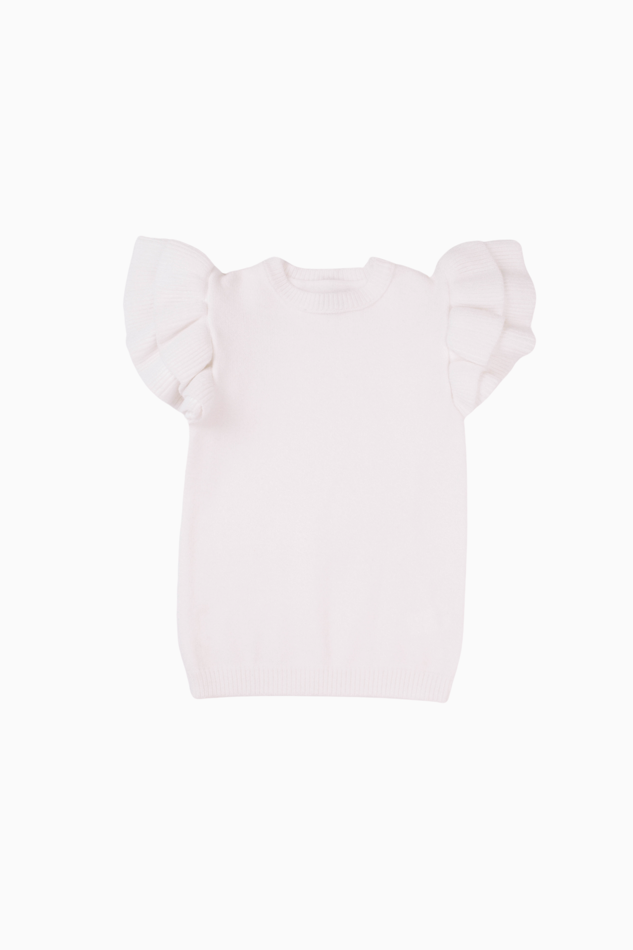 Brighten up her wardrobe with this white tween sweater top, finished with sweet ruffle cap sleeves. A playful yet polished piece made to stand out. Pair it with our Cody Tween Skirt or Torian Tween Skirt for a cozy-cute look!