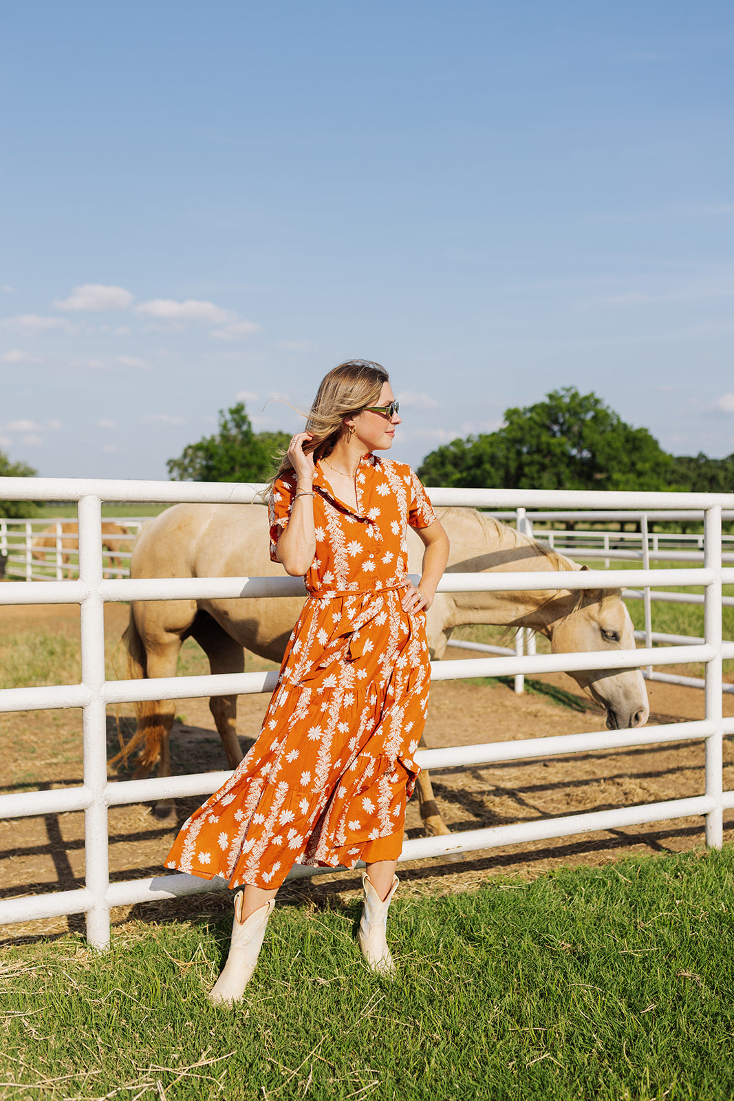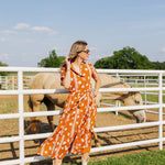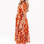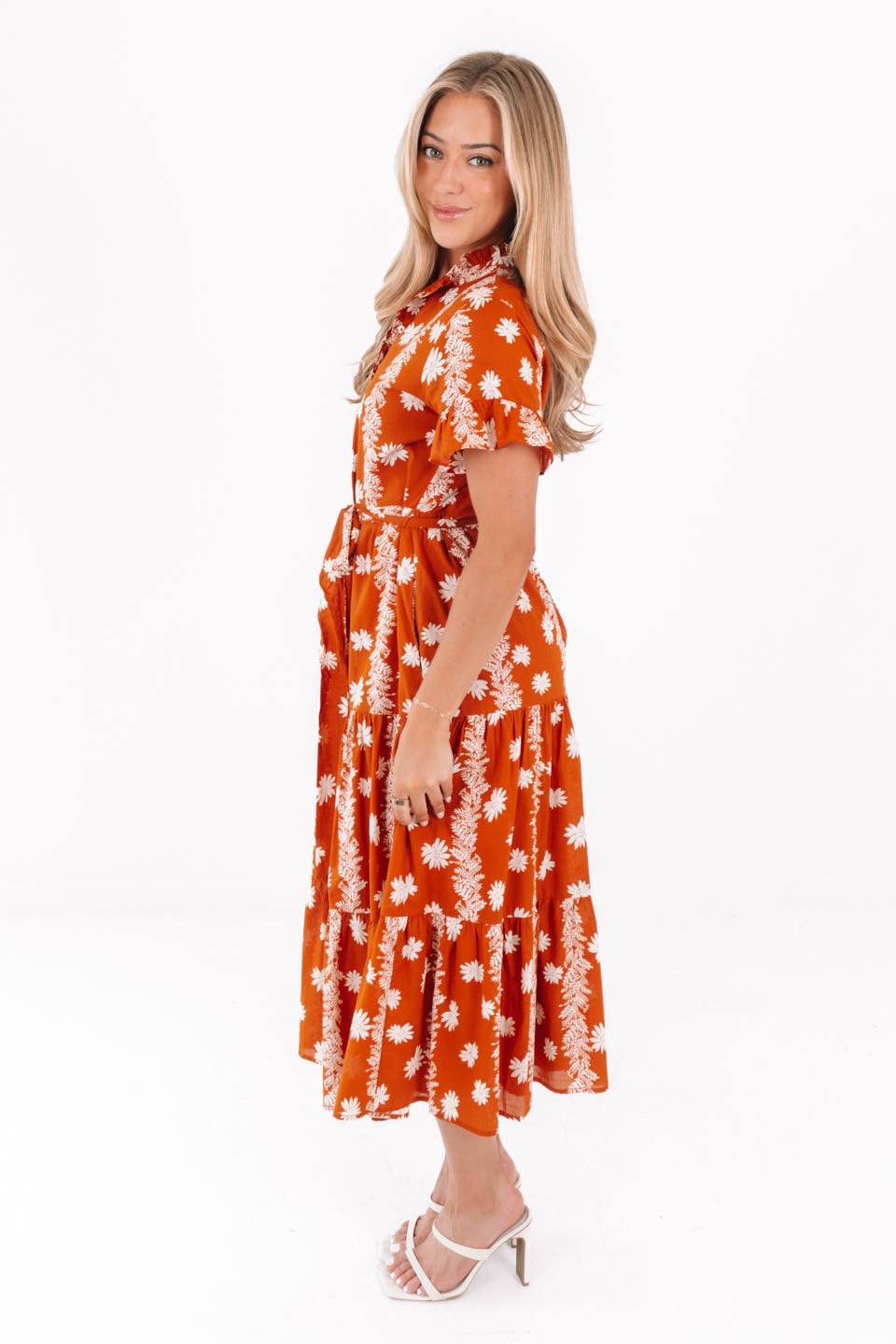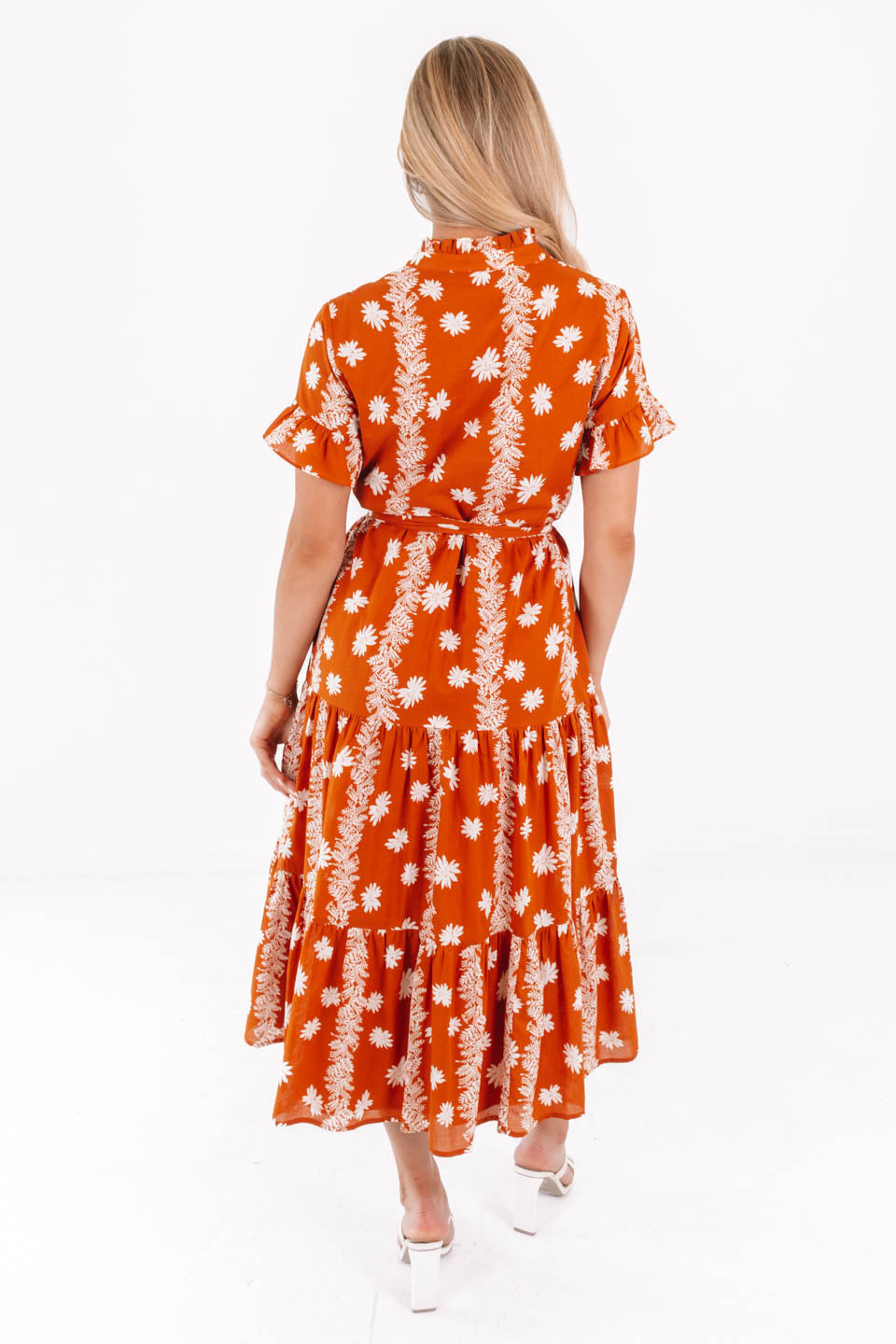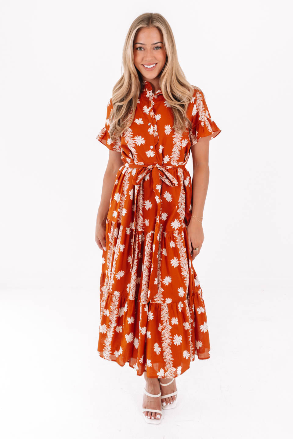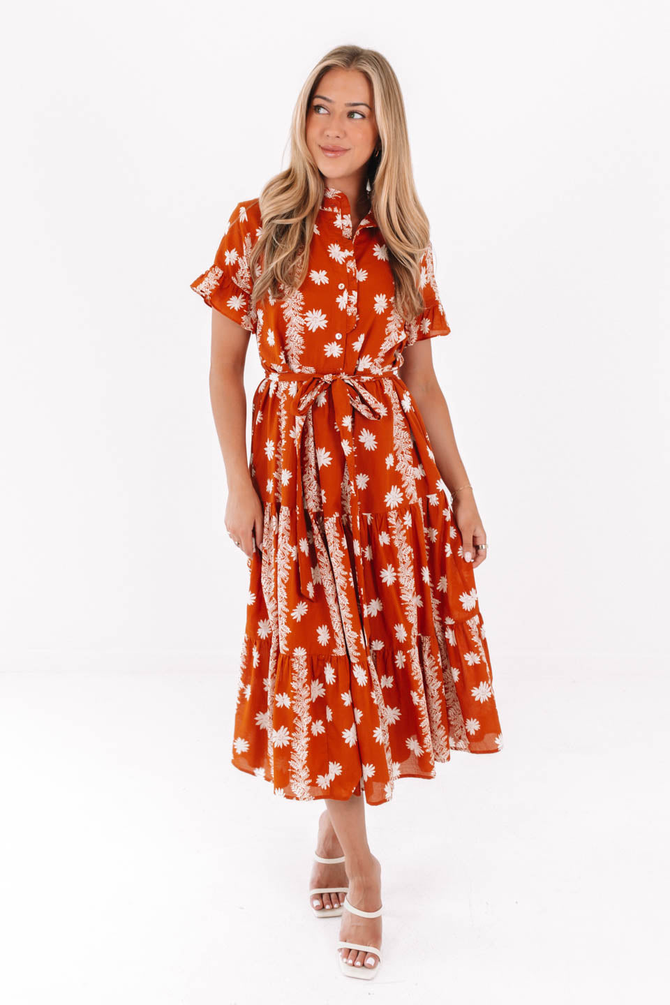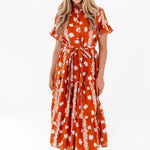 This charming burnt orange midi dress showcases a delicate white floral print and a flattering adjustable tie waist for a timeless, feminine look. The button-up neckline and short sleeves add a classic touch, making it effortlessly polished. With its warm tones and easy silhouette, it’s the perfect piece for fall outings or brunch dates.