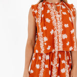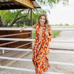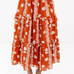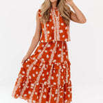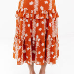 This vibrant midi skirt features a striking floral print and a flattering tiered design, creating a playful and lively look. The flowy silhouette adds a touch of movement and ease, making it perfect for warm days while tailgating. Pair it with our Aubrey Button Up Top for a stylish, effortless ensemble!