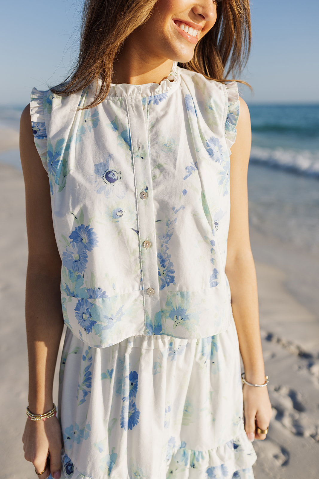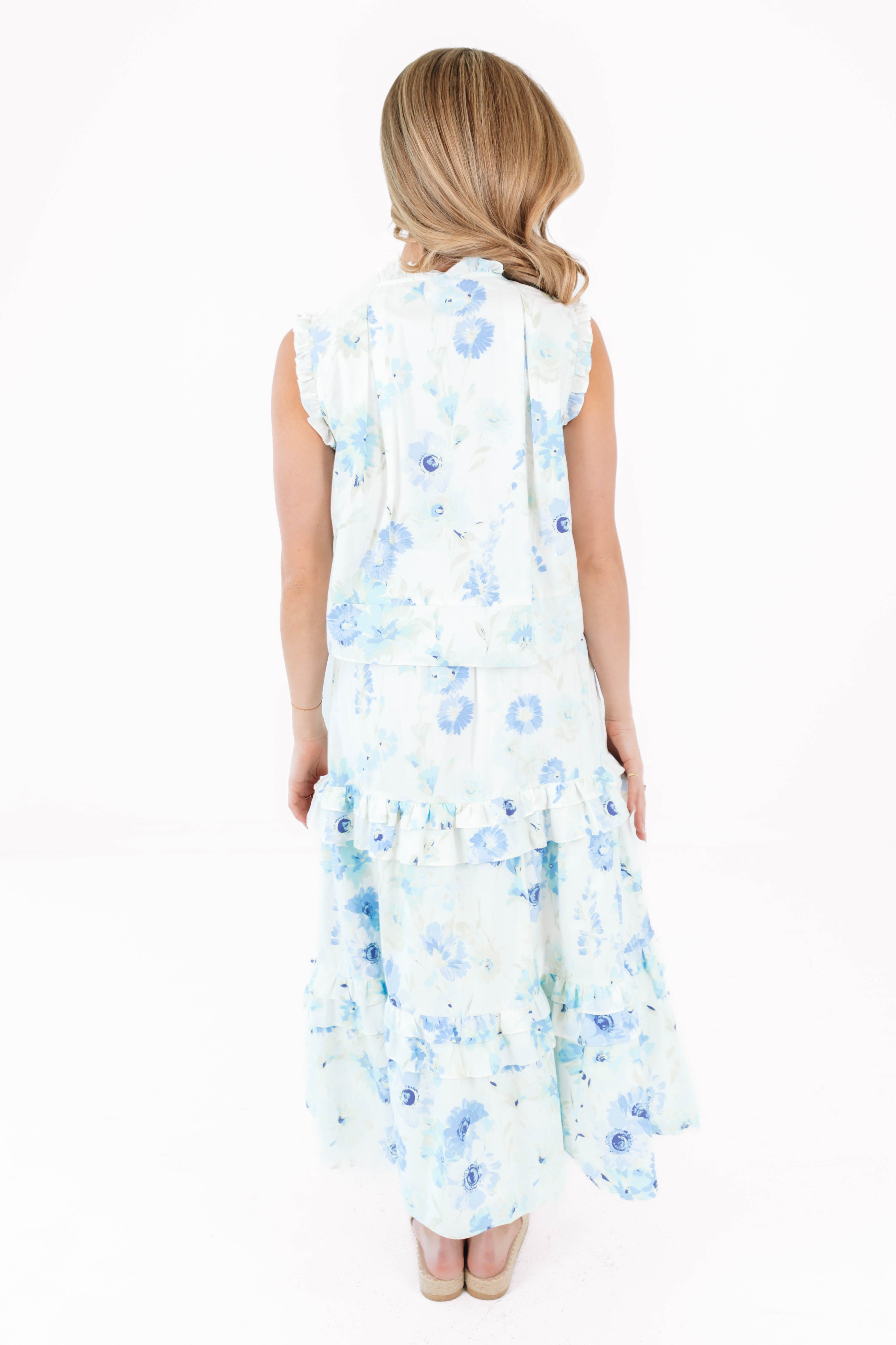 This feminine button-up top features delicate blue floral print, adding a romantic touch to your spring wardrobe. With its lightweight feel & easy, flattering fit, it’s both polished & effortless—perfect for pairing with the Blakely Midi Skirt for brunch dates, weekend strolls, or any sunny day outing!