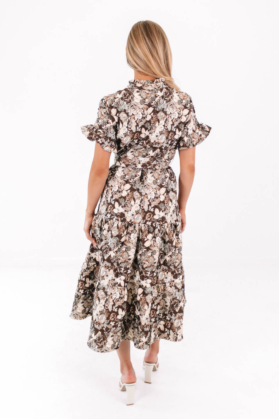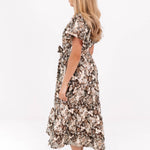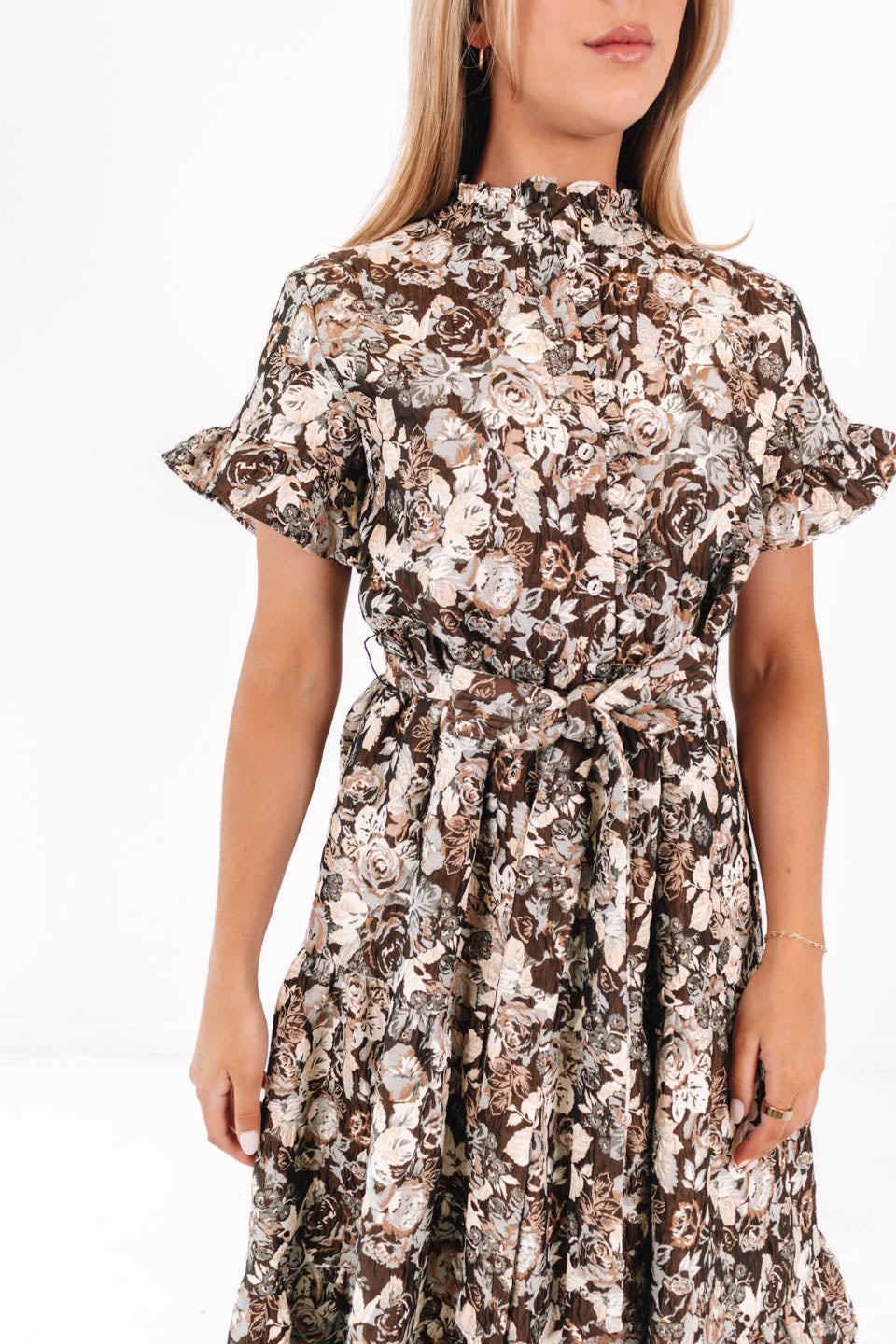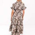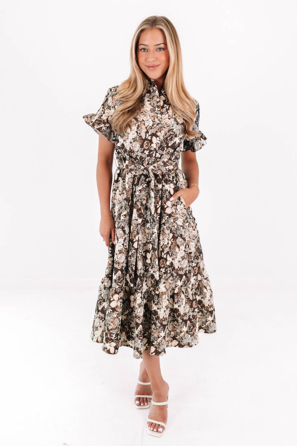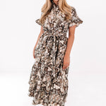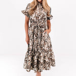 This charming cream midi dress showcases a bold print and a flattering adjustable tie waist for a timeless, feminine look. The button-up neckline and short sleeves add a classic touch, making it effortlessly polished. With its warm tones and easy silhouette, it’s the perfect piece for fall outings or brunch dates.