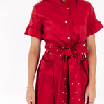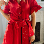 Add a polished touch to your wardrobe with this red dress featuring elegant pearl accents & two front pockets. The button-up neckline & sleek silhouette create a chic, refined vibe - perfect for special occasions or stylish family photos. Pair with your favorite tights & heels for a complete, holiday look!