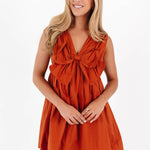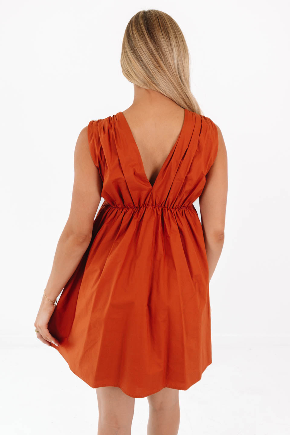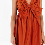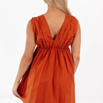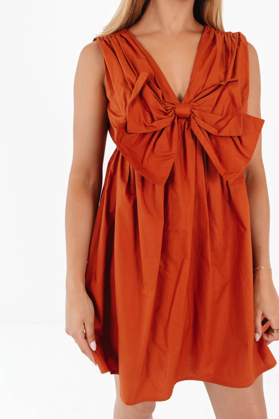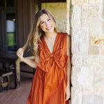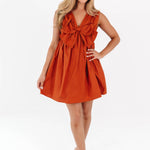 This spirited burnt orange dress features a charming front bow and pleated detailing for a flirty, feminine vibe. The v-neckline and cinched under-bust create a flattering silhouette, perfect for making a statement. Ideal for college gameday or a festive fall outing, this dress pairs spirit with standout style effortlessly!