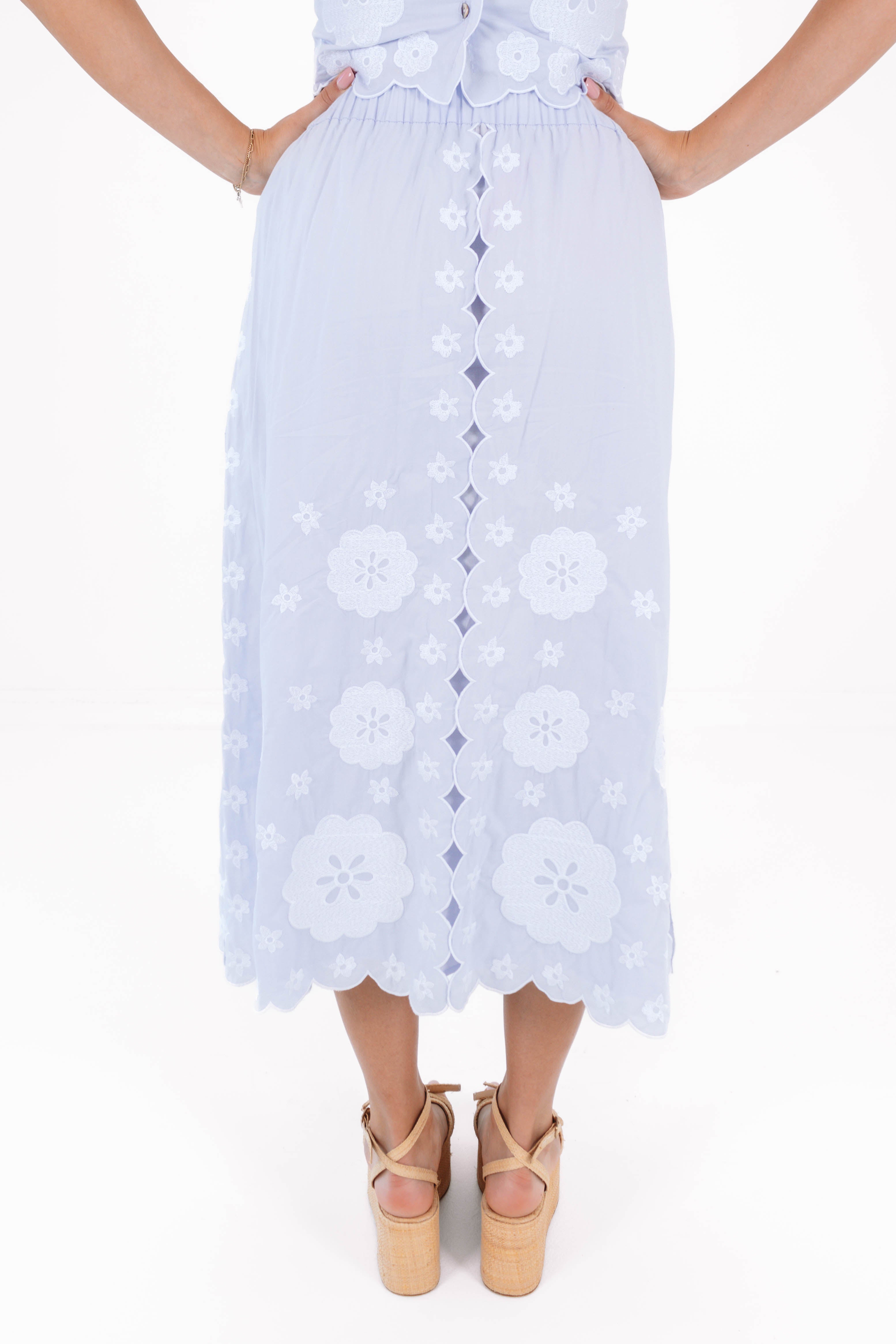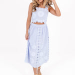 This elegant midi skirt features a soft periwinkle hue with delicate embroidered detailing for a romantic, elevated feel. Designed with a flattering, flowy silhouette that moves beautifully with every step, it’s both timeless & versatile—perfect for pairing with our Ember Top for garden parties, brunch dates, or any spring celebration.
