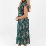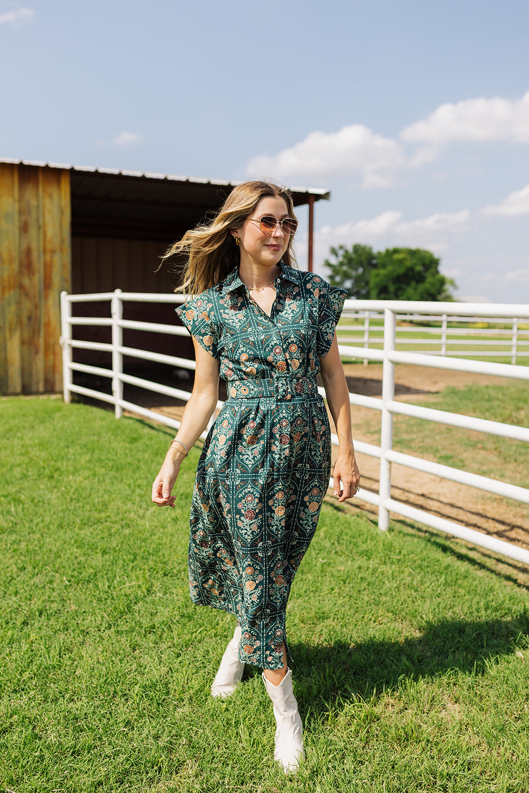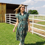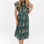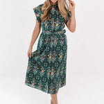 This charming hunter midi dress showcases a intricate print & a flattering belted waist for a timeless, feminine look. The button-up neckline and short sleeves add a classic touch, making it effortlessly polished. With its warm tones & easy silhouette, it’s the perfect piece for fall outings or brunch dates.