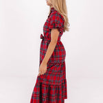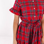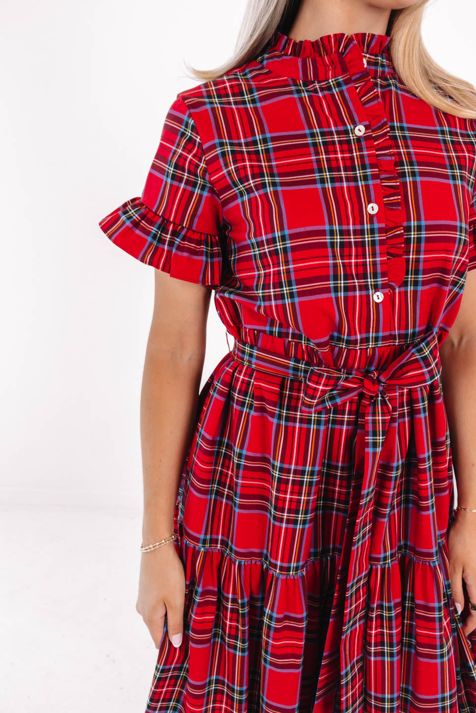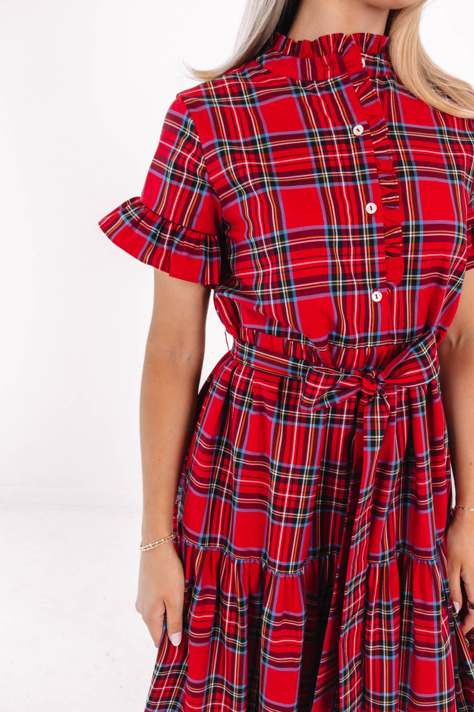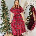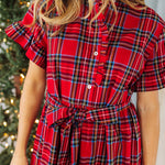 Bring holiday cheer to your wardrobe with this red plaid midi dress, featuring a classic button-up neckline & an adjustable tie belt. The cheerful print & flattering silhouette bring a joyful, seasonal charm - perfect for holiday gatherings. Pair with your favorite heels for the perfect holiday look!