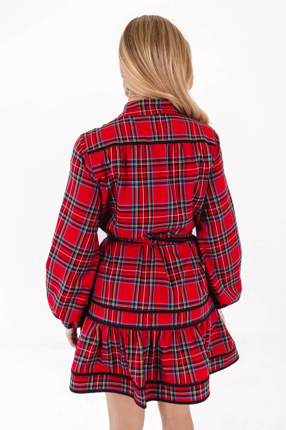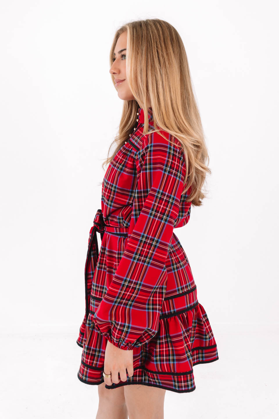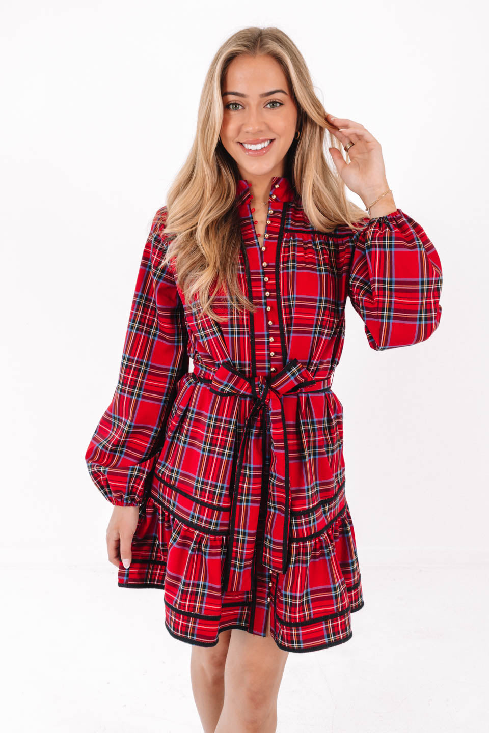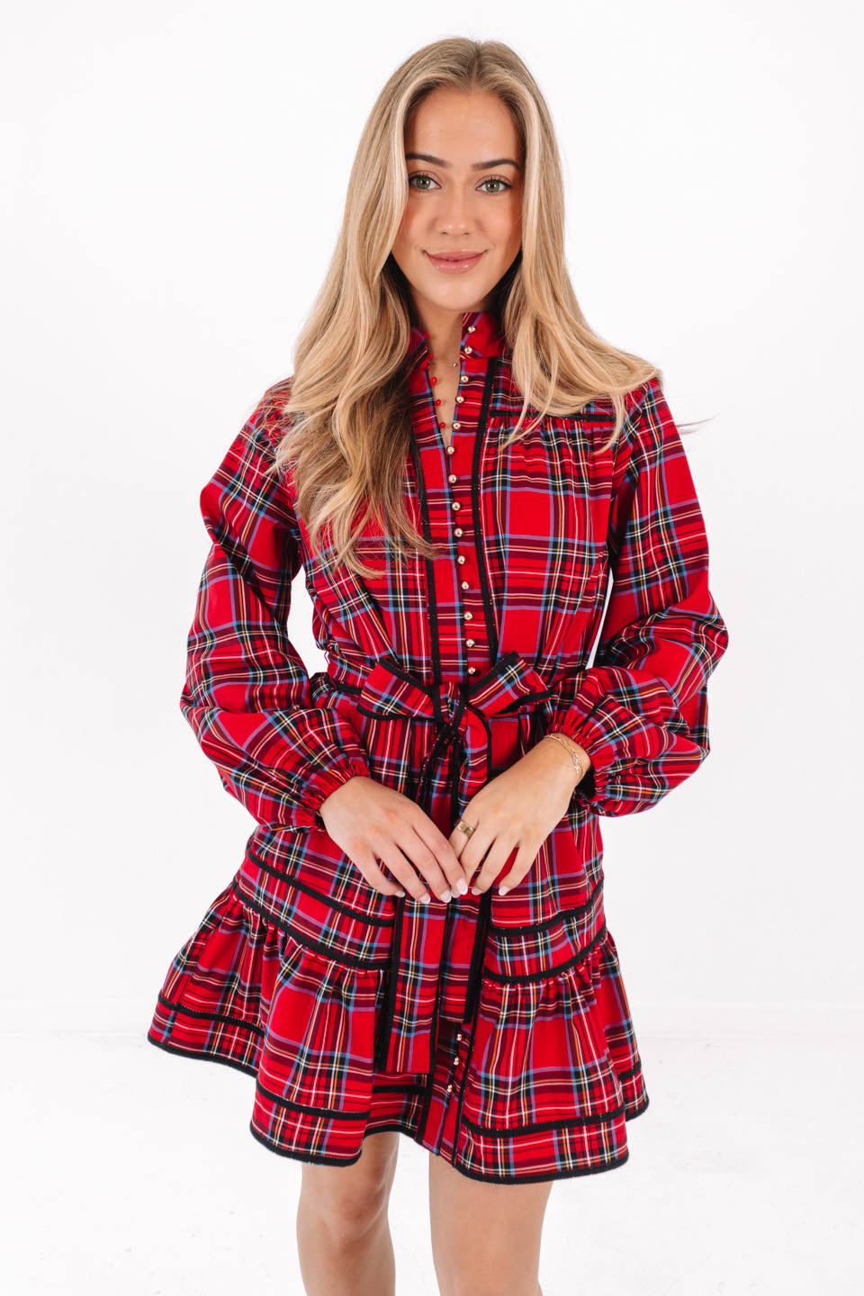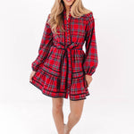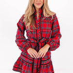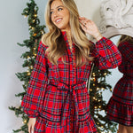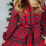 Add a festive touch to your wardrobe with this green & red plaid dress featuring a gold button up front. The long cuff sleeves & sleek silhouette create a chic, refined vibe - perfect for special holiday occasions or stylish family photos. Pair with your favorite heels for a complete, holiday look!