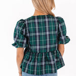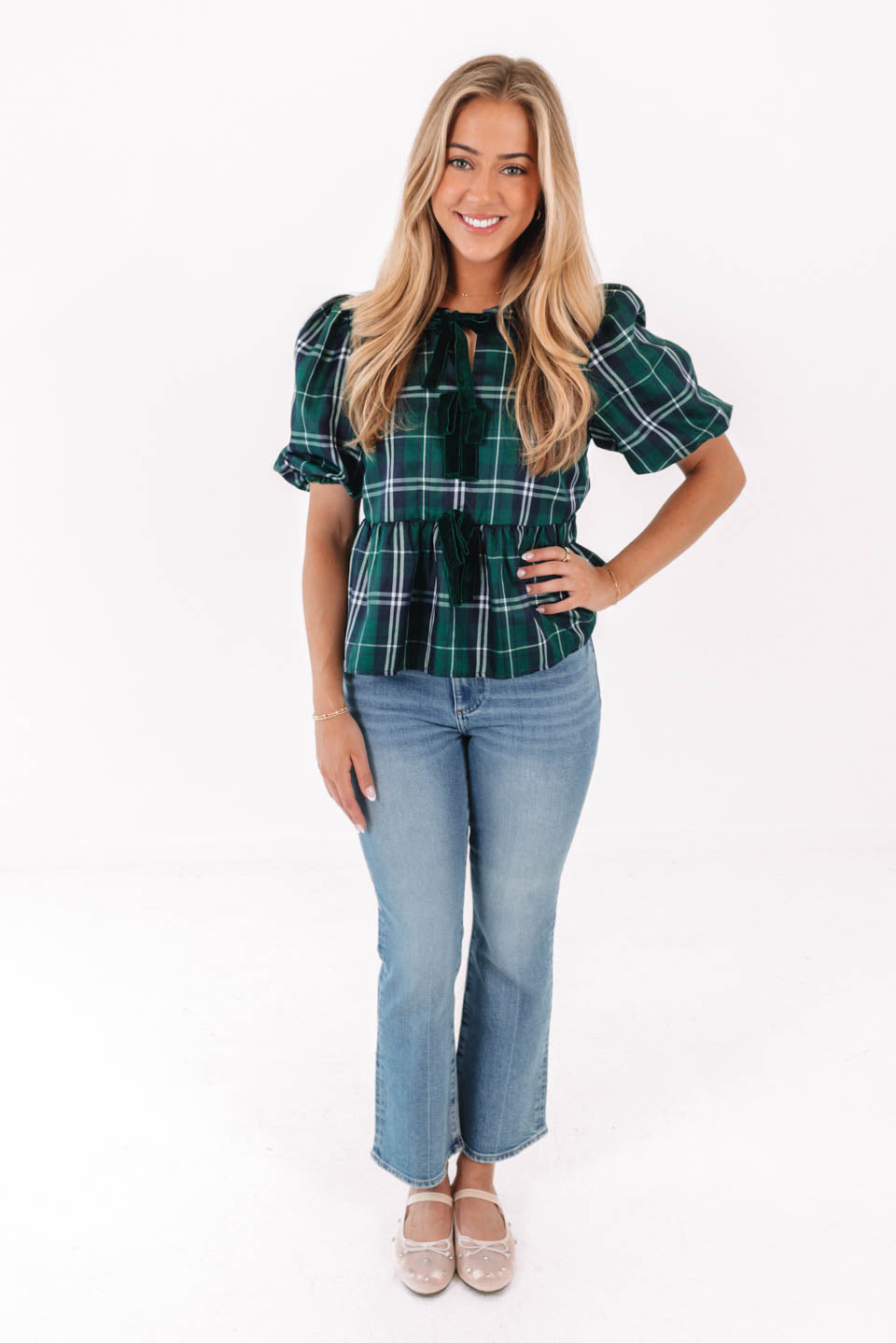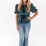 Add a festive touch to your holiday wardrobe with this green plaid tie top, designed with a darling bows & puff sleeves. The cheerful plaid & graceful accents add a classic, seasonal charm - perfect for joyful gatherings & twinkling holiday moments. Pair with our Jordyn Skort for the perfect holiday look!