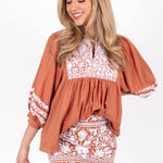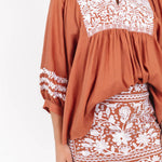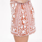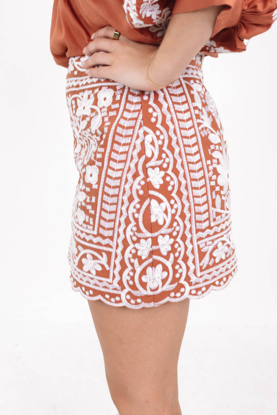 Add a playful touch to your fall wardrobe with this high-waisted embroidered skirt in a burnt orange hue. Delicate scallop trim and vibrant white stitching bring a whimsical, feminine flair. Perfect for twirling through sunny days & tailgating nights. Pair with our Maria Top for a gameday go-to outfit!