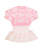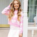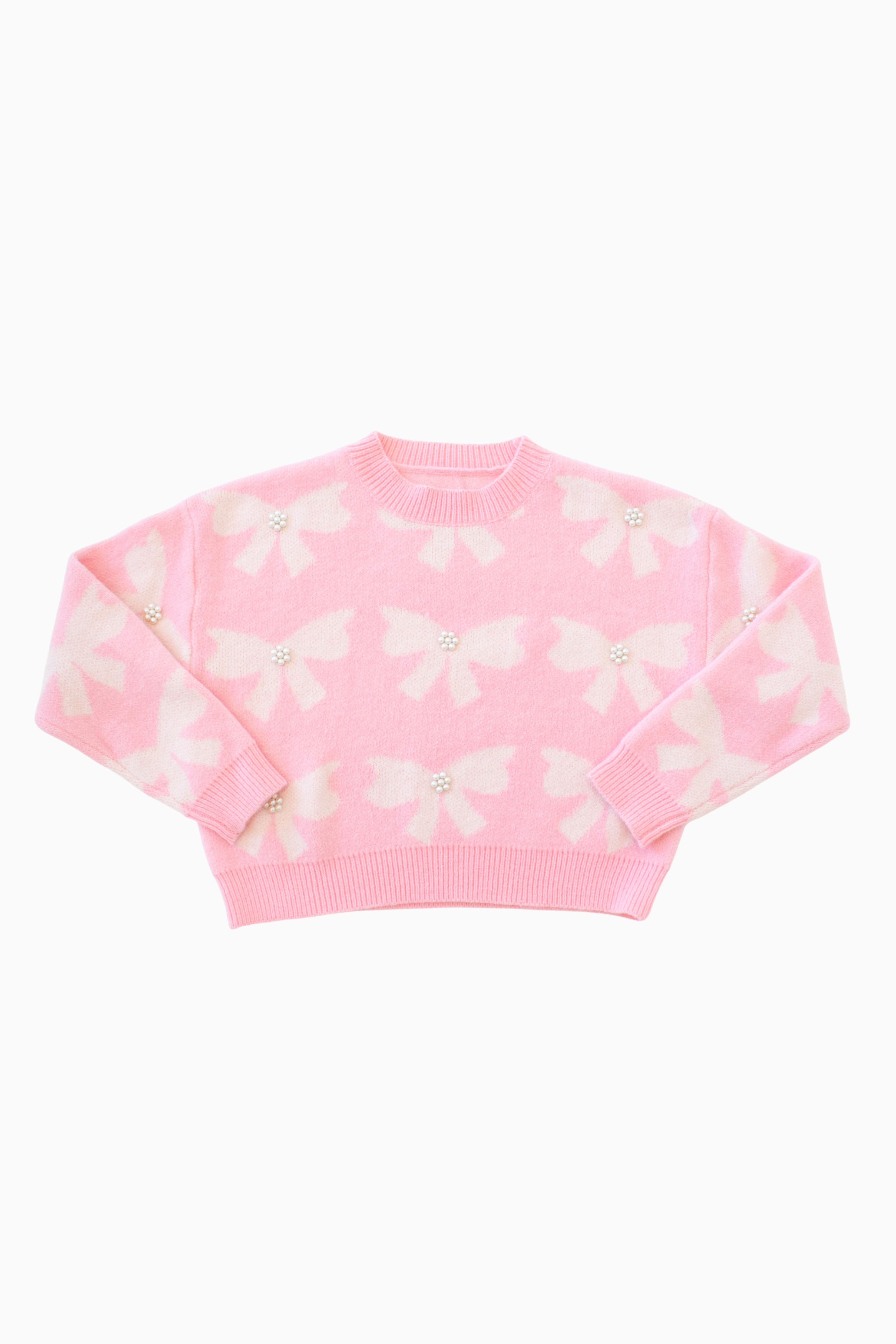 Add a darling touch to her wardrobe with this pink tween sweater, accented with sweet white bows and delicate pearl details. A playful yet polished piece designed to stand out with charm and coziness. Pair it with our Hayes Tween Skirt in pink for a cozy-cute look!