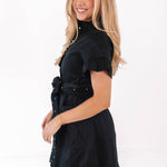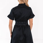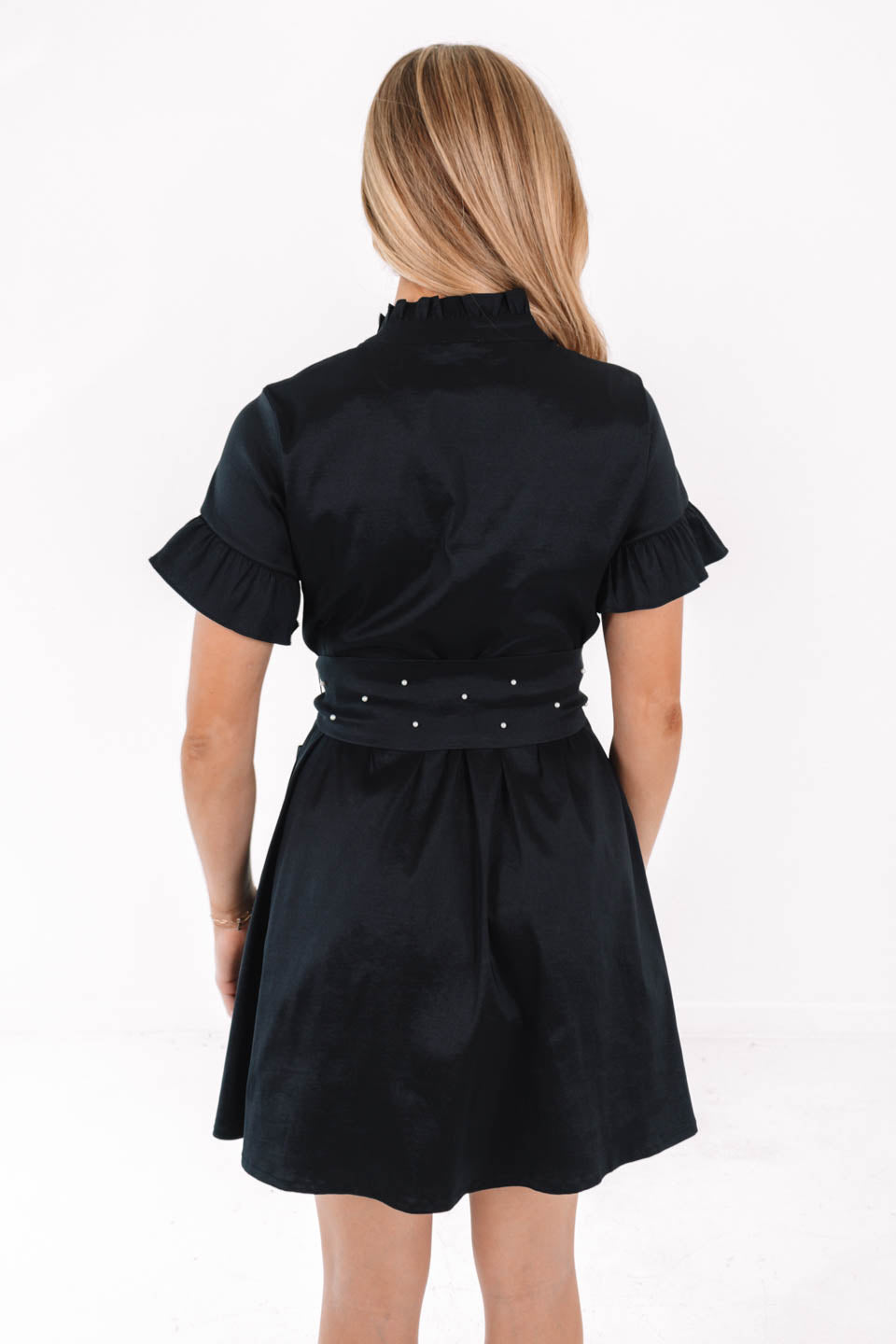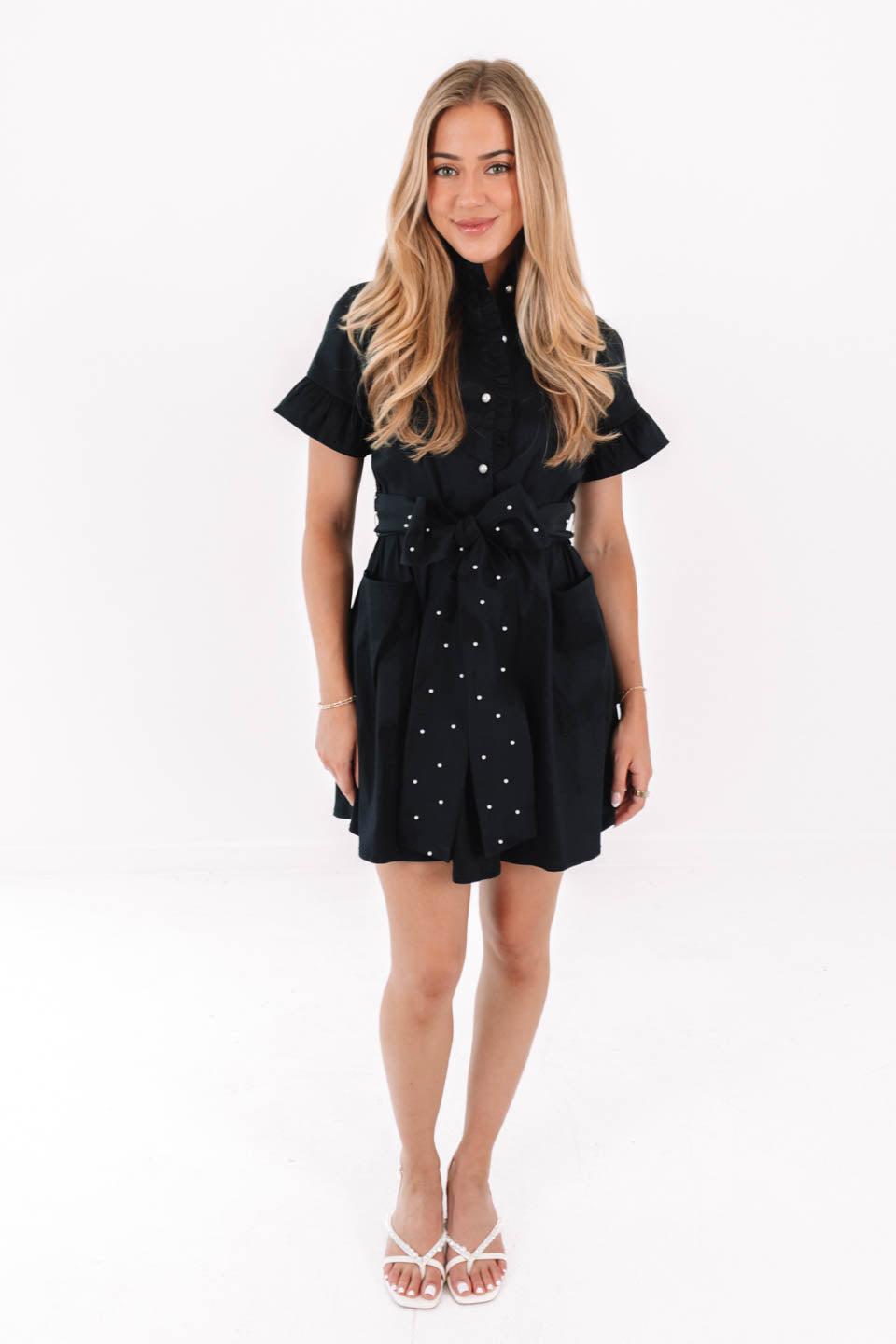 Add a polished touch to your wardrobe with this black dress featuring elegant pearl accents & two front pockets. The button-up neckline & sleek silhouette create a chic, refined vibe - perfect for special occasions or stylish family photos. Pair with your favorite tights & heels for a complete, holiday look!