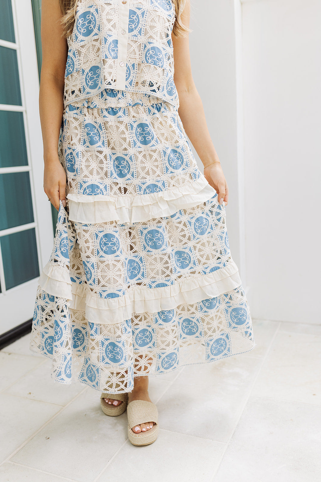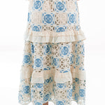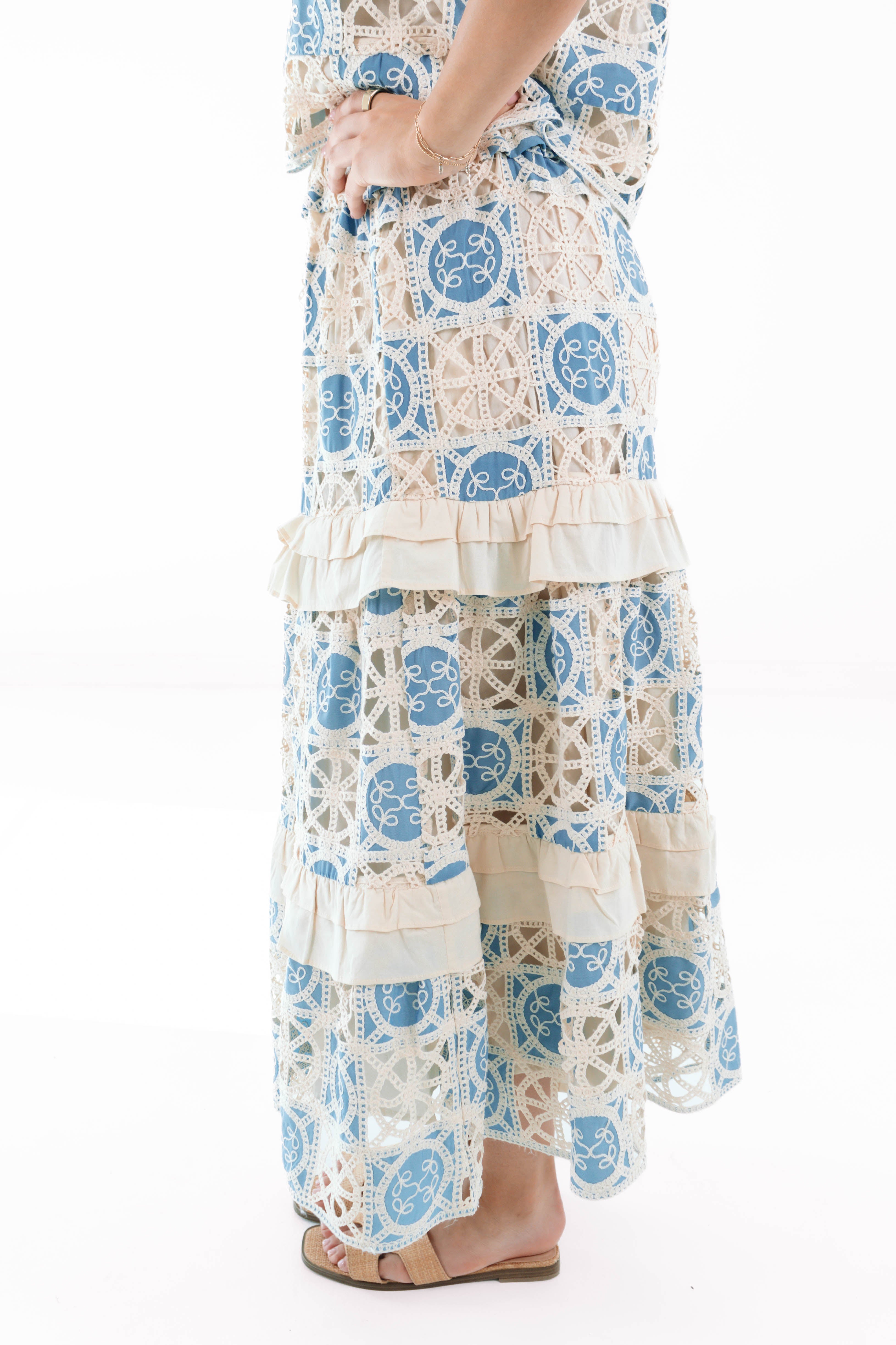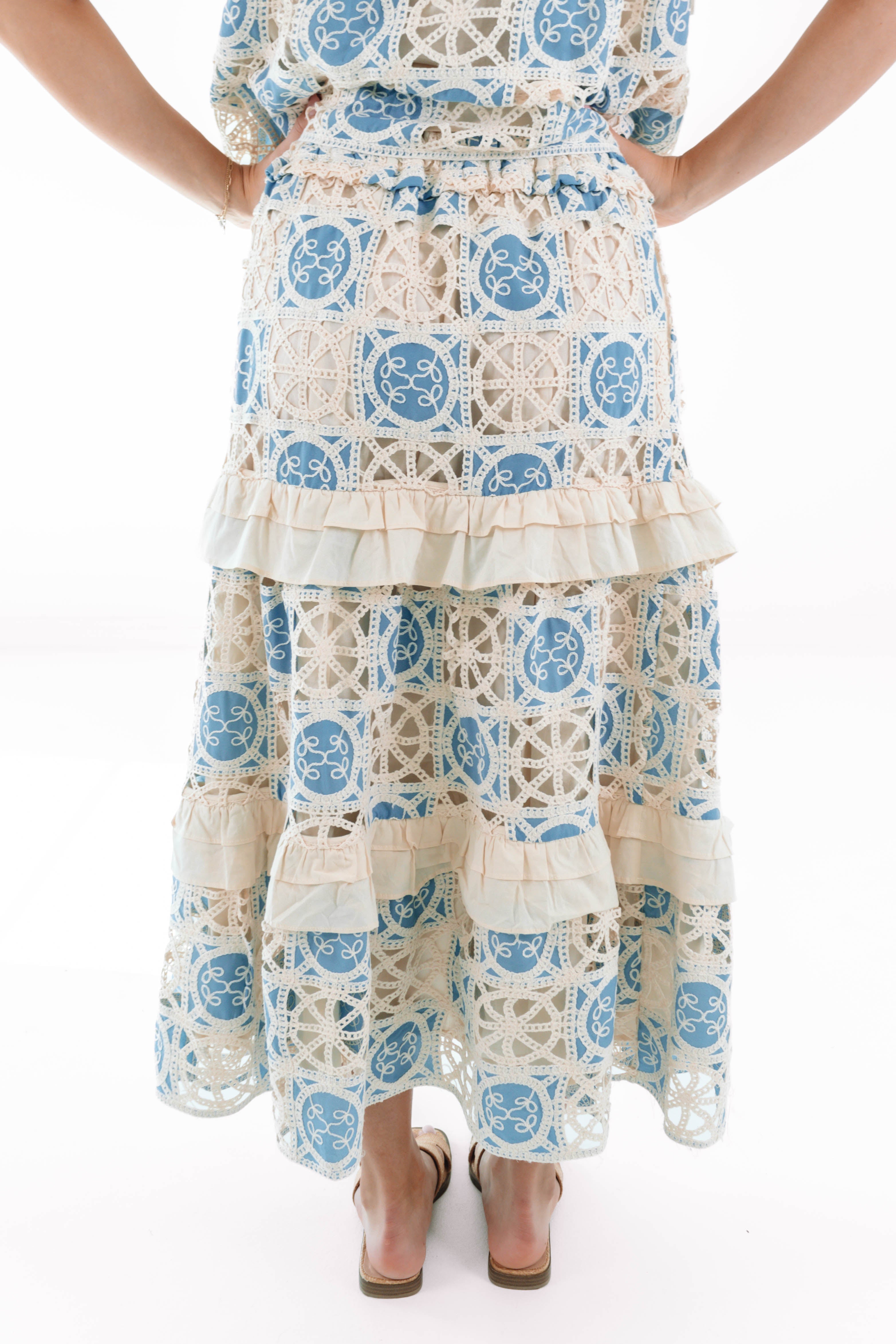 This charming midi skirt features a cream base adorned with a delicate blue floral lace, bringing a fresh, romantic feel to your spring wardrobe. With its flattering length & easy, flowy silhouette, it’s both timeless & versatile—perfect for pairing with our Reece Button Up Top for brunch dates, weekend outings, or sunny strolls.